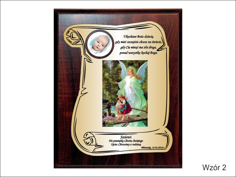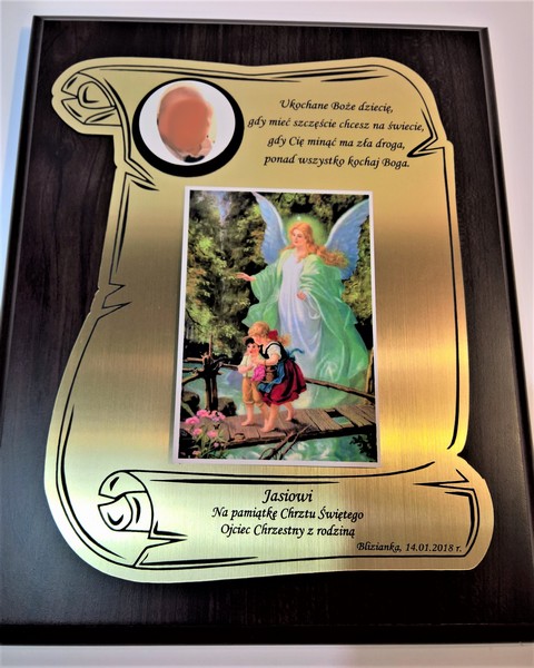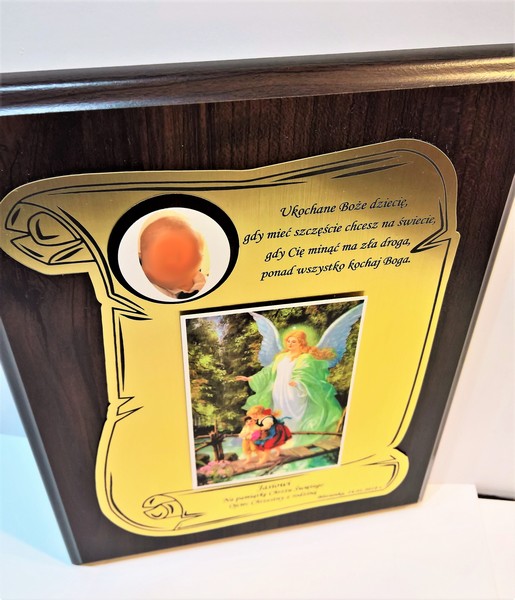 Dodatkowo na białej blaszce wykonany jest nadruk zdjęcia dziecka lub Anioła Stróża czuwającego nad dziećmi na kładce.