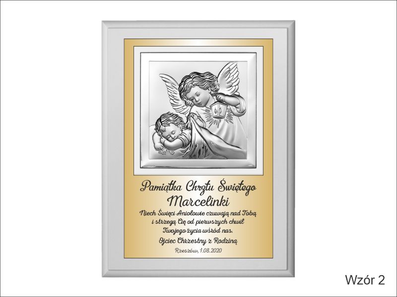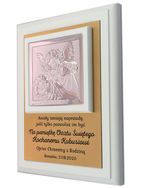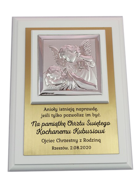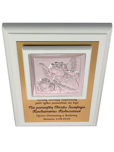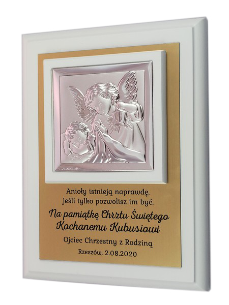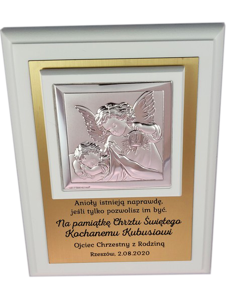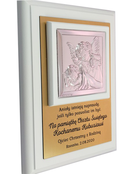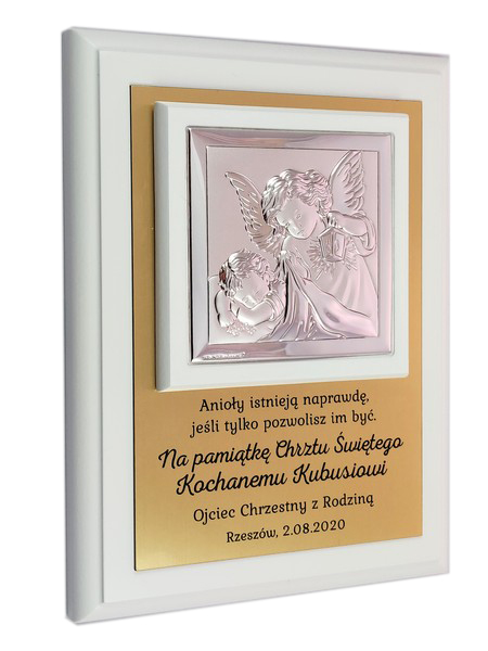 Prezent z okazji Chrztu Świętego w formie wyjątkowej pamiątki - srebrnego obrazka z aniołkiem na złotej tabliczce i białym podkładzie.