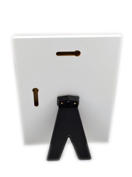 Obrazek wraz z tabliczką przymocowany jest do eleganckiego białego podkładu drewnianego.