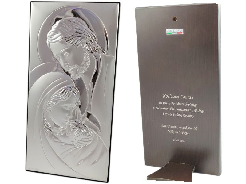 Prezent na pamiątkę Chrztu Świętego w postaci srebrnego obrazka z wizerunkiem Św. Rodziny z grawerem.