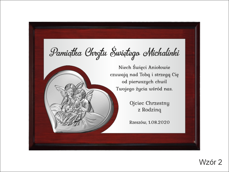 - ze srebrnego laminatu z wygrawerowaną dedykacją i wyciętym miejscem na obrazek,