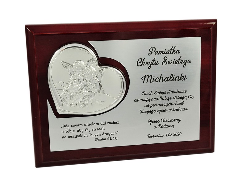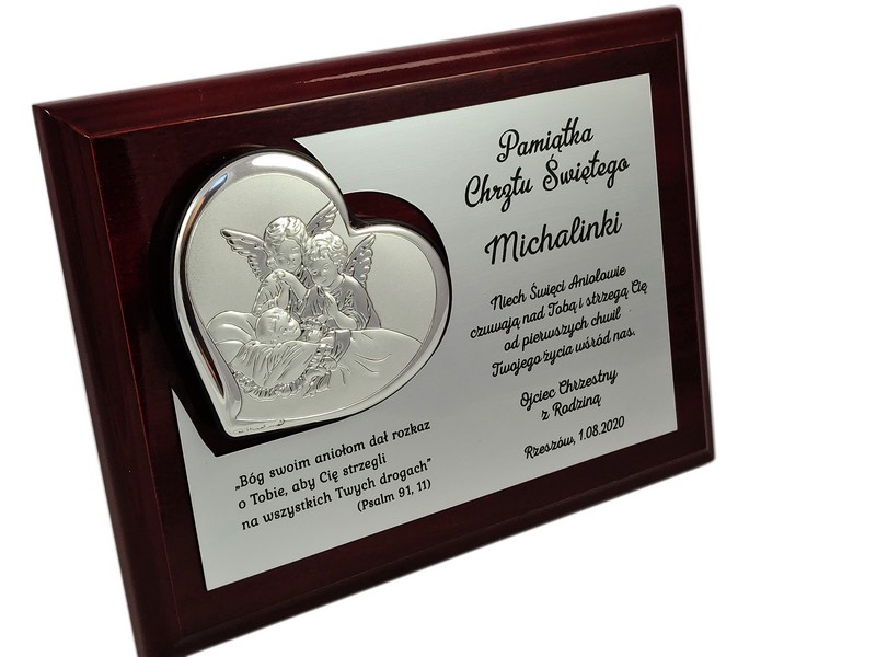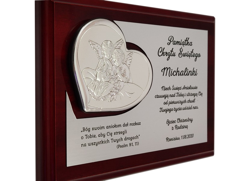 Pamiątka Chrztu Świętego w formie wyjątkowego upominku - srebrnego obrazka z aniołkami w sercu na ciemnym drewnie.