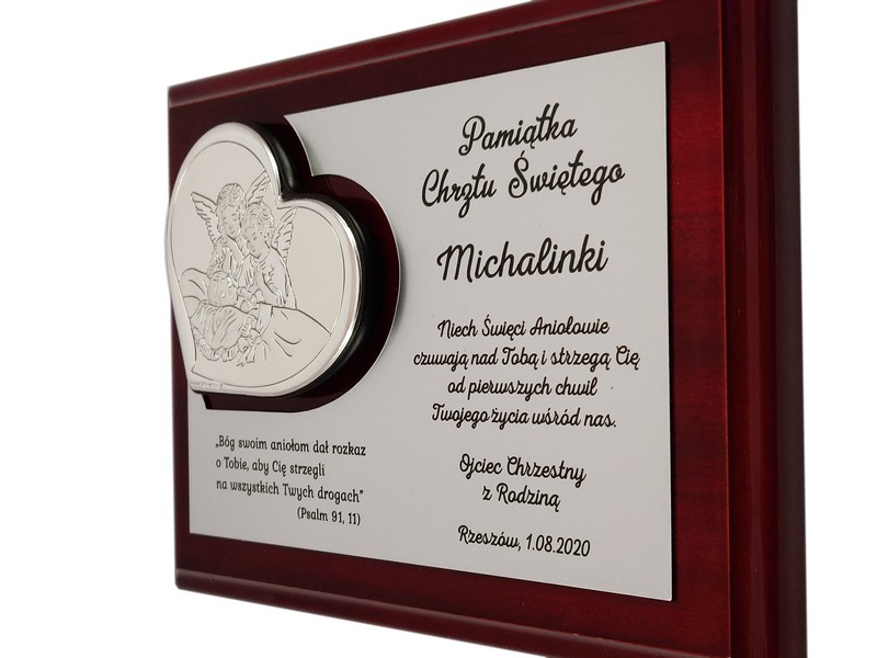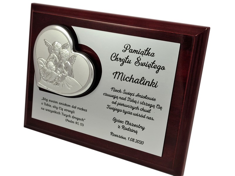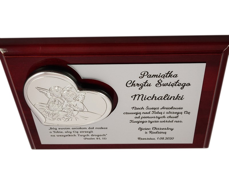 Dedykacja jest wygrawerowana w srebrnym laminacie, w którym wycięte jest także miejsce na srebrny obrazek.