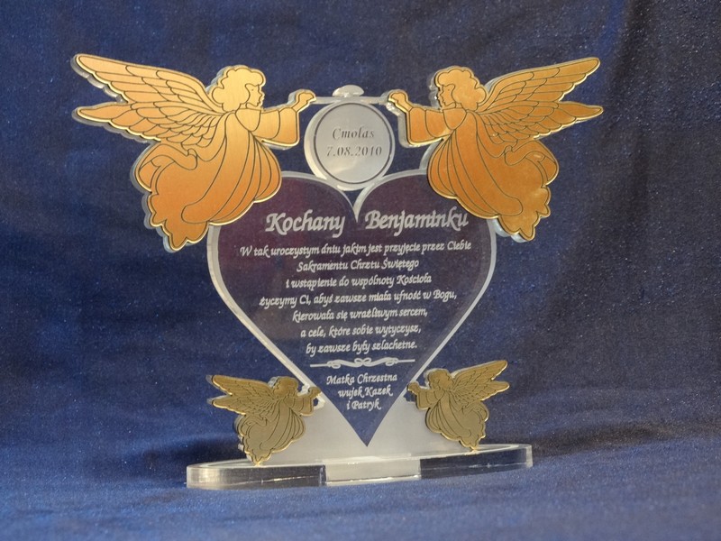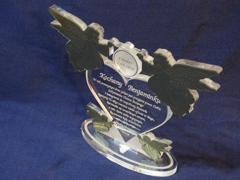 Statuetka z pleksi bezbarwnej z grawerem dedykacji i ozdobnych grafik z okazji Chrztu Świętego z motywem "Aniołków".