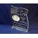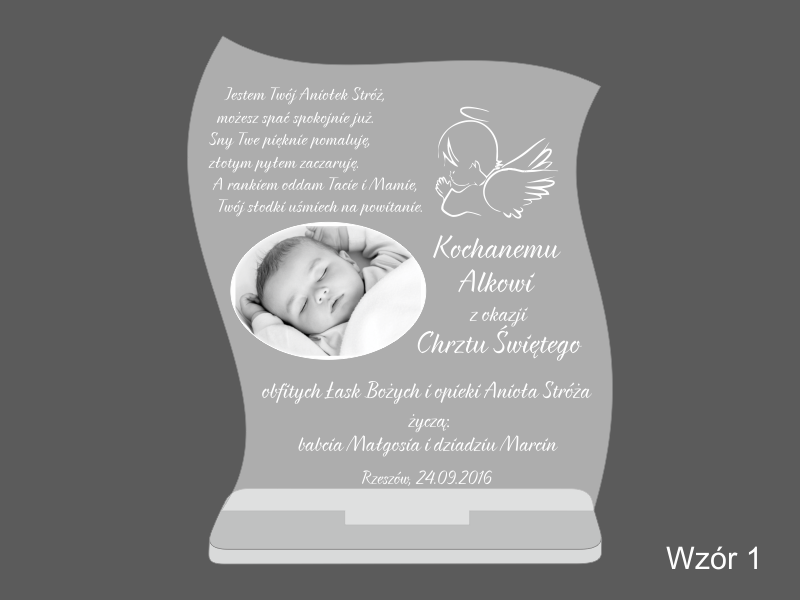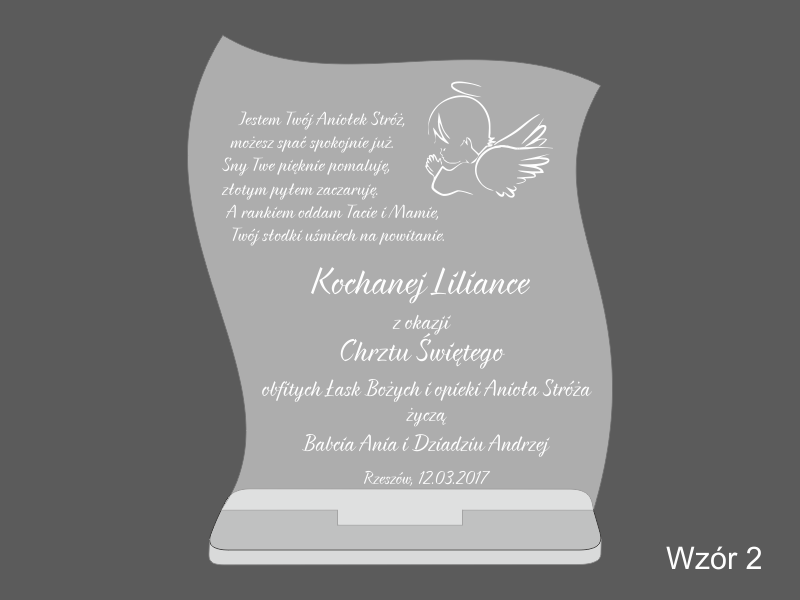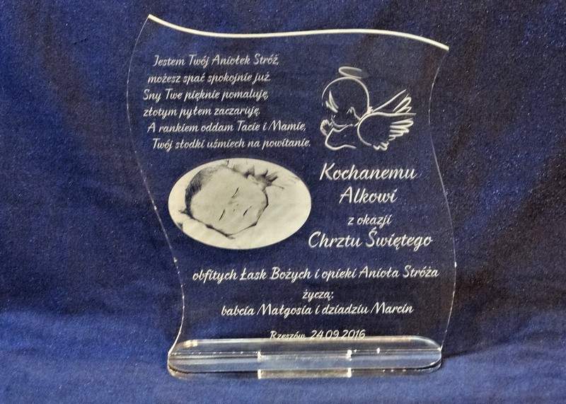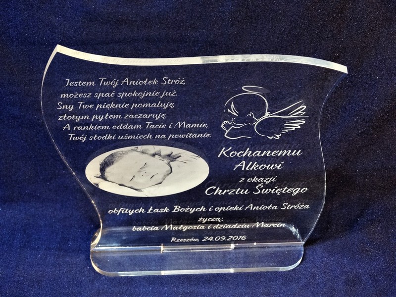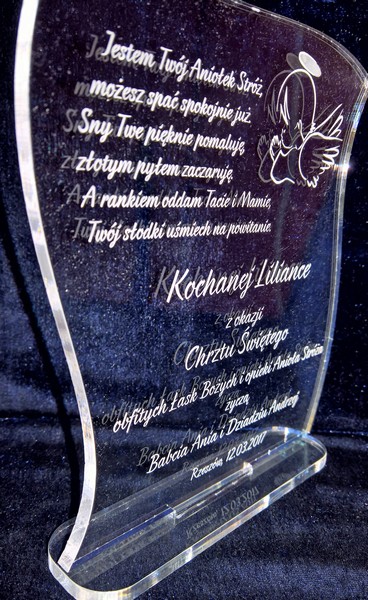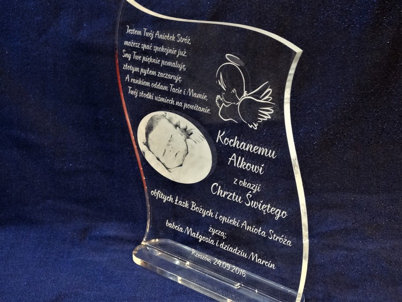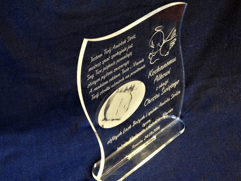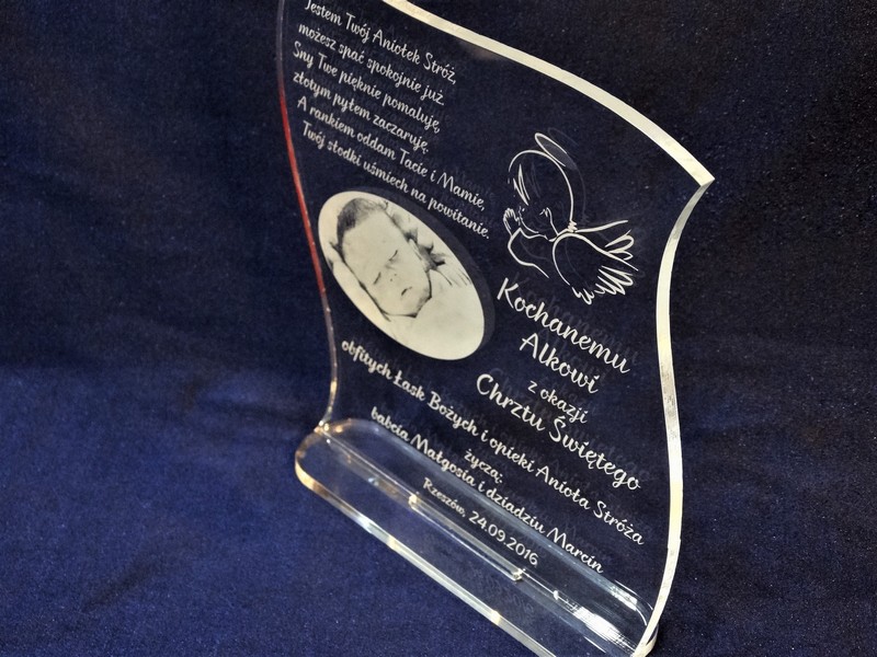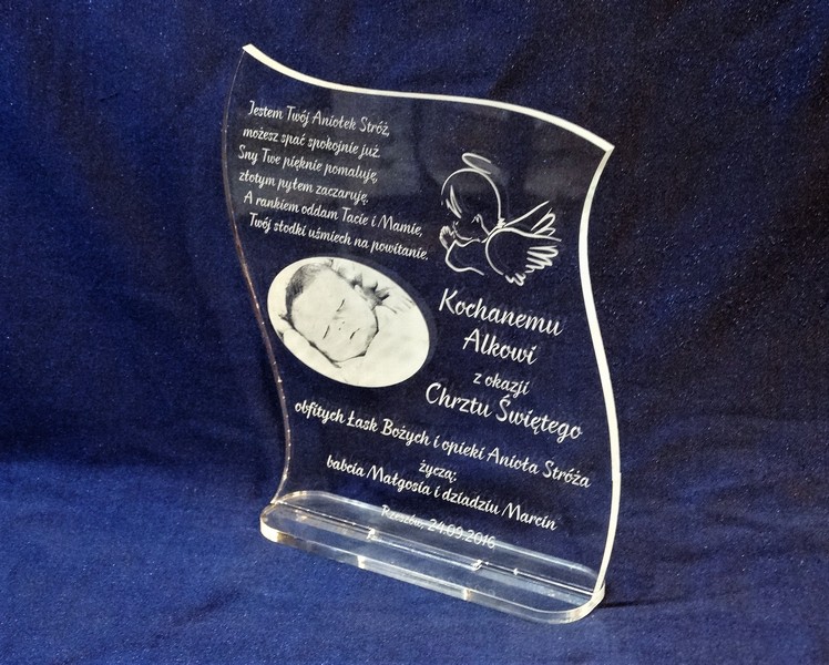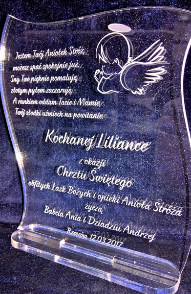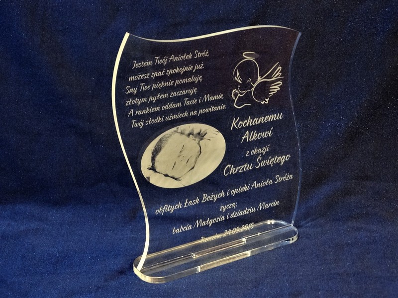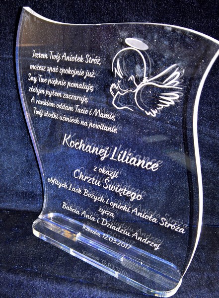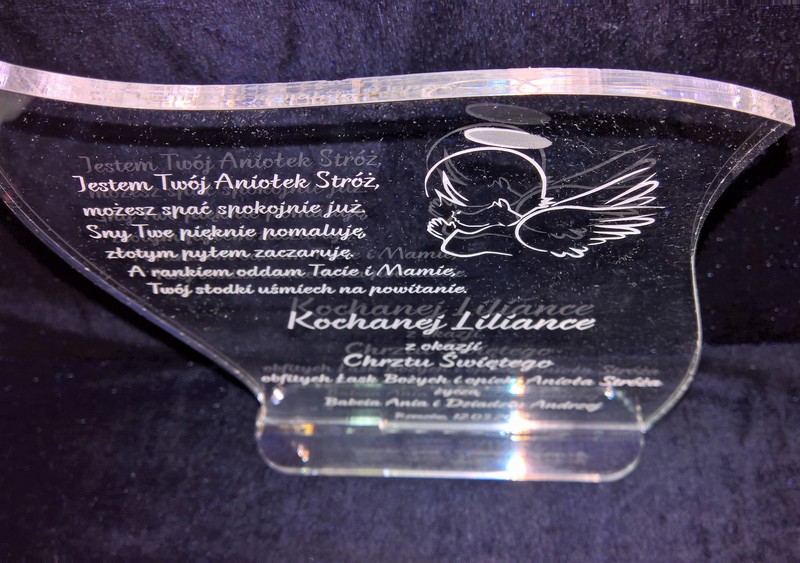 Statuetka z pleksi bezbarwnej z grawerem dedykacji i dziecięcego aniołka z okazji Chrztu Świętego w kształcie falowanego prostokąta.