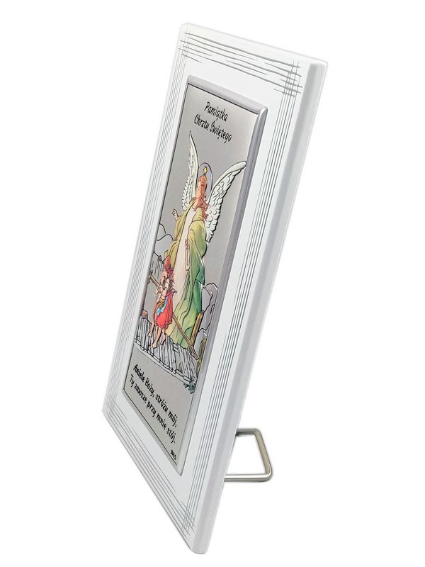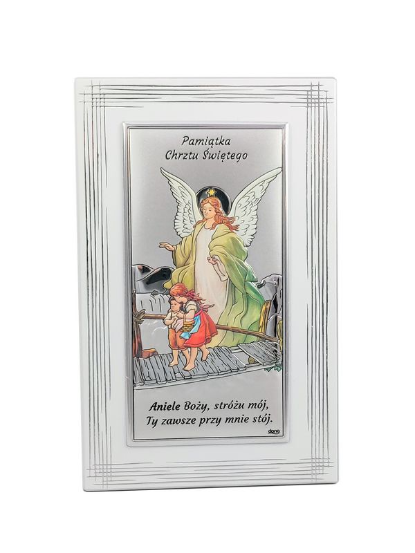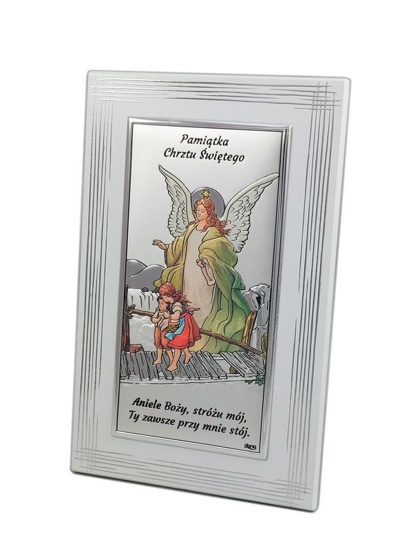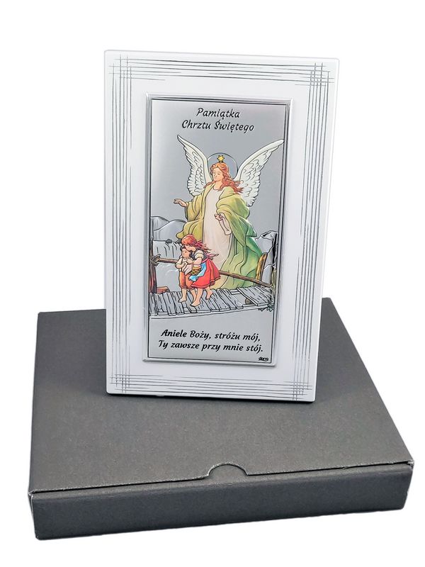 Srebrny obrazek DS43F/C w wersji z malowaniem ma prostokątny kształt i przedstawia Anioła Stróża czuwającego nad dziećmi na kładce.