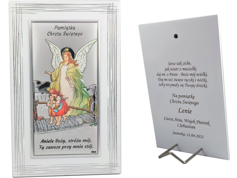 Pamiątka Chrztu Świętego w postaci kolorowego srebrnego obrazka z Aniołem Stróżem na białym drewnie z grawerem.