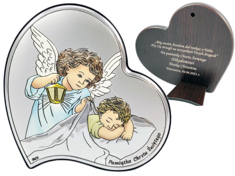 Pamiątka z okazji Chrztu Świętego w postaci kolorowego srebrnego obrazka z Aniołkiem w kształcie serca z grawerem.