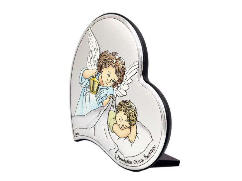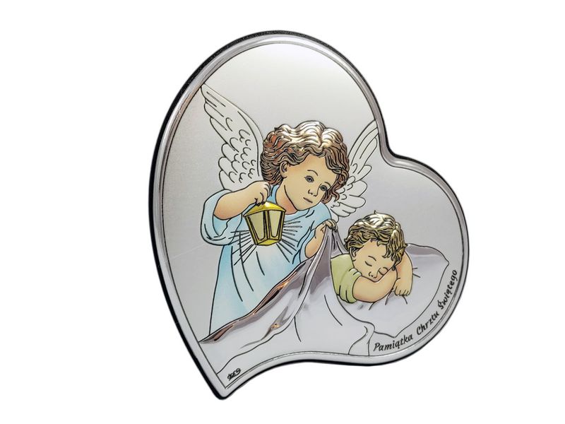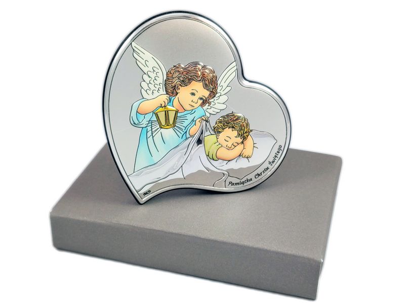 Srebrny obrazek DS17/C w wersji z malowaniem ma kształt serca i przedstawia Aniołka z latarenką nad dzieckiem.