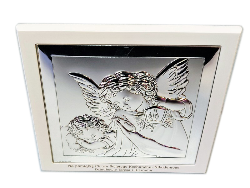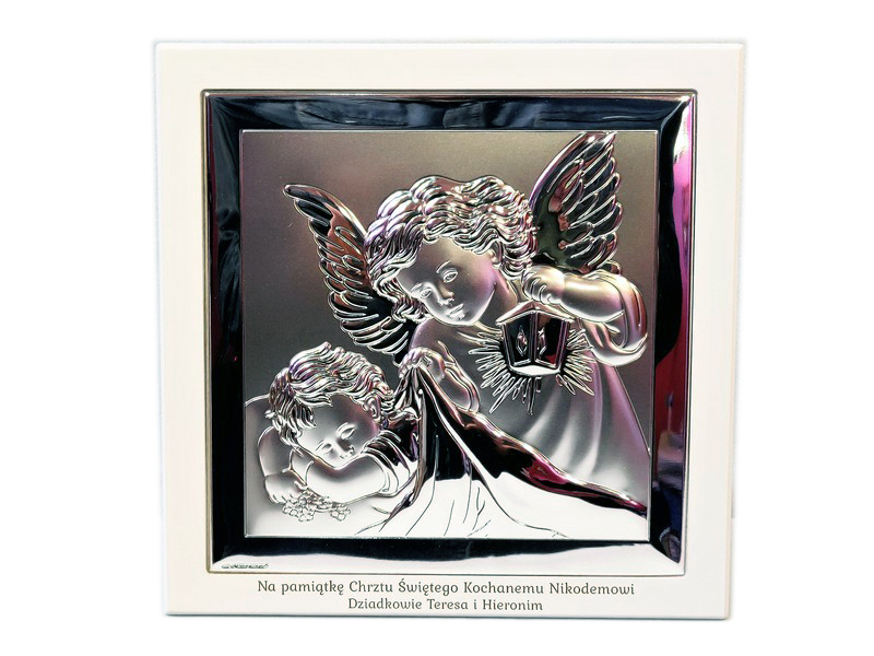 Srebrny Obrazek "Aniołek z latarenką nad dzieckiem 6387W kwadratowy z białą ramką" ma wygrawerowaną dedykację z okazji Chrztu Świętego.