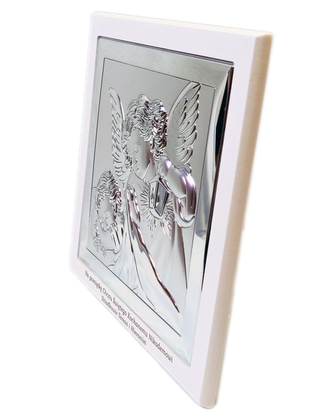 Prezent na pamiątkę Chrztu Świętego w formie srebrnego obrazka z Aniołkiem w kwadratowym kształcie na białej drewnianej ramce.