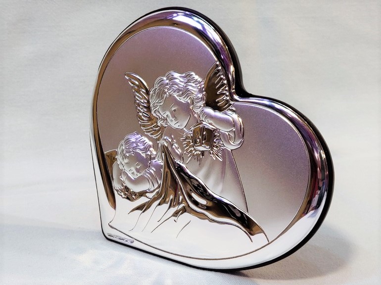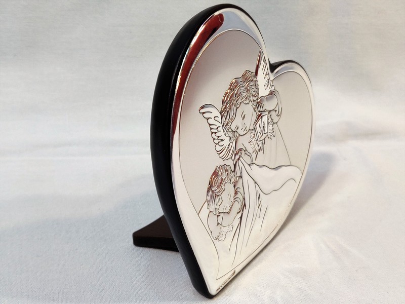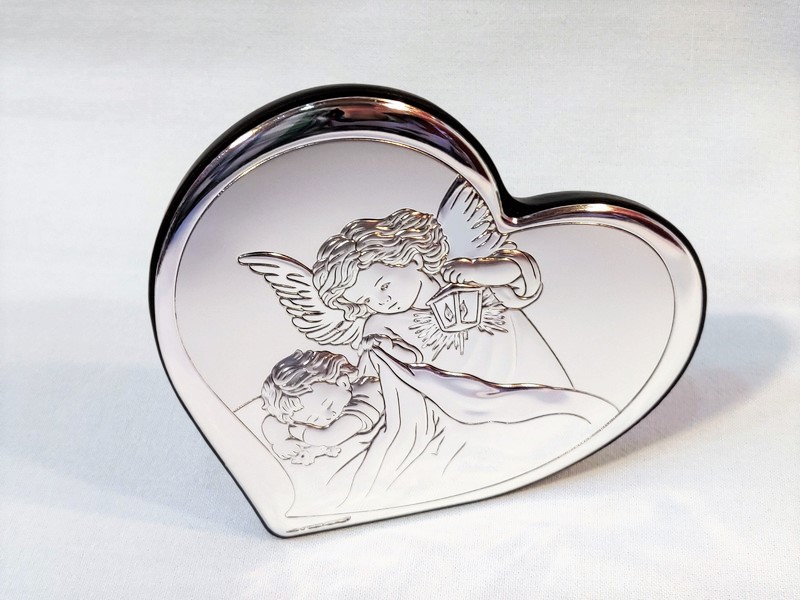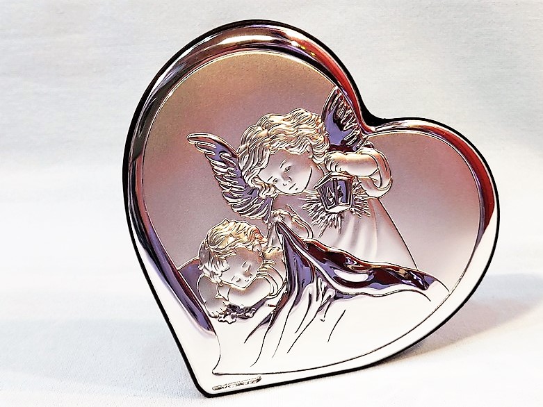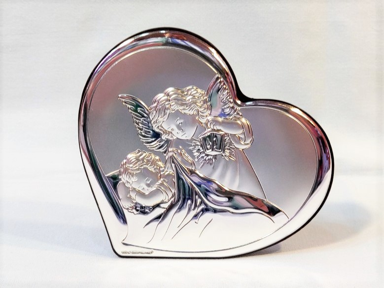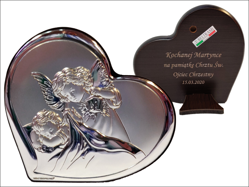 Upominek na pamiątkę Chrztu Świętego w postaci srebrnego obrazka z Aniołkiem w sercu.