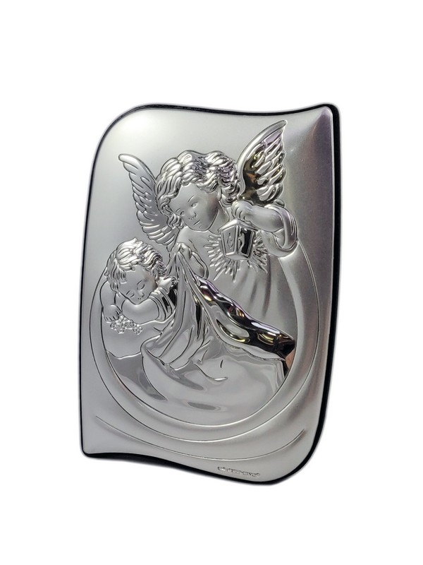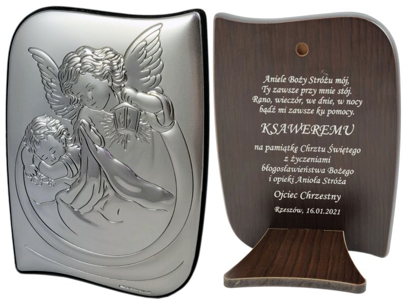 Prezent z okazji Chrztu Świętego w formie srebrnego obrazka z Aniołkiem w nieregularnym kształcie z grawerem.