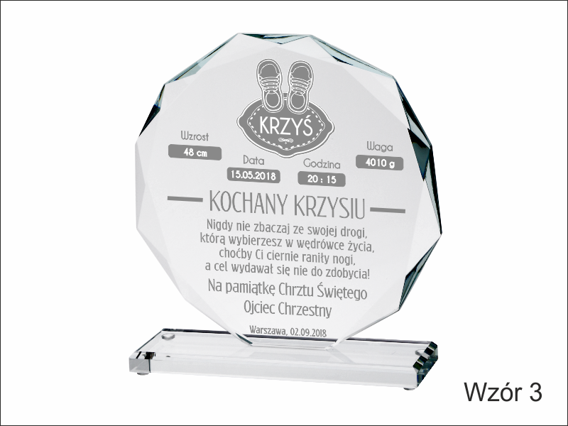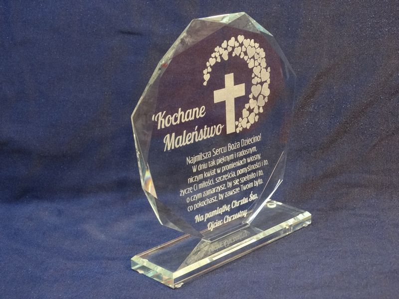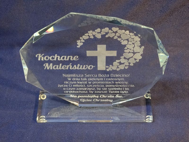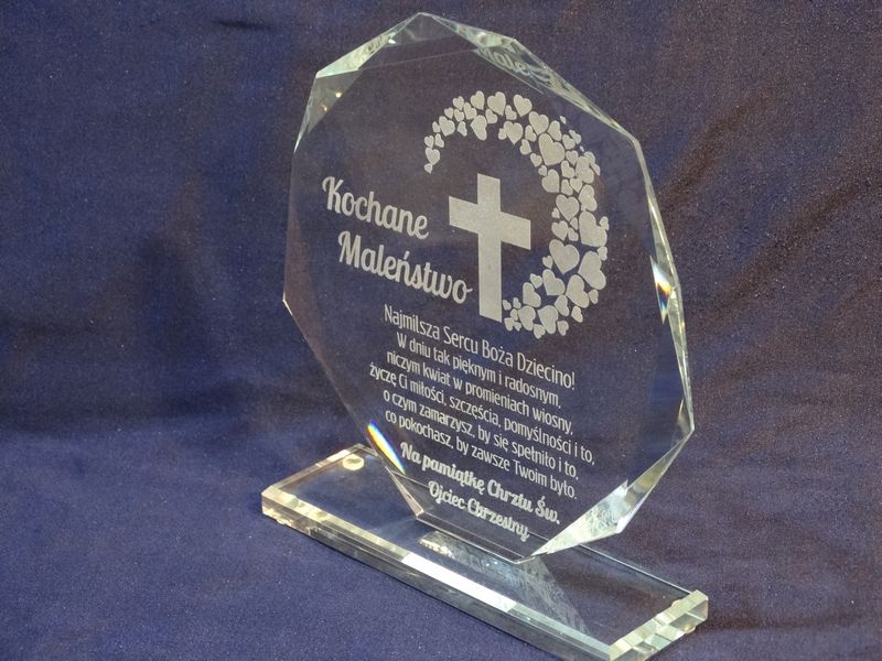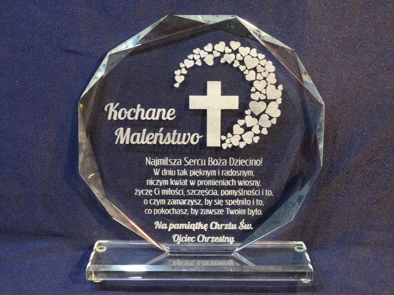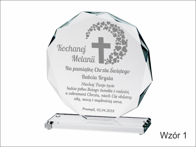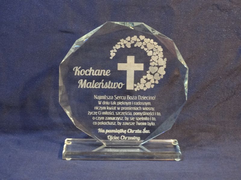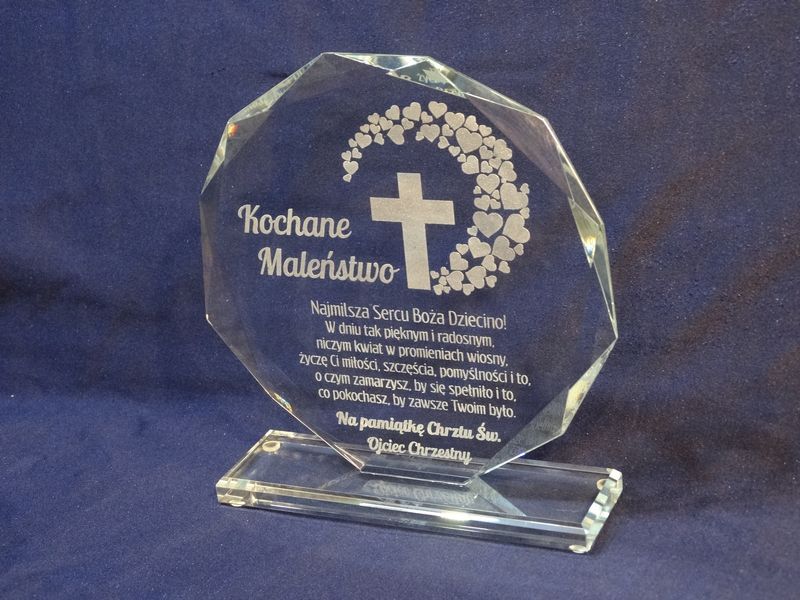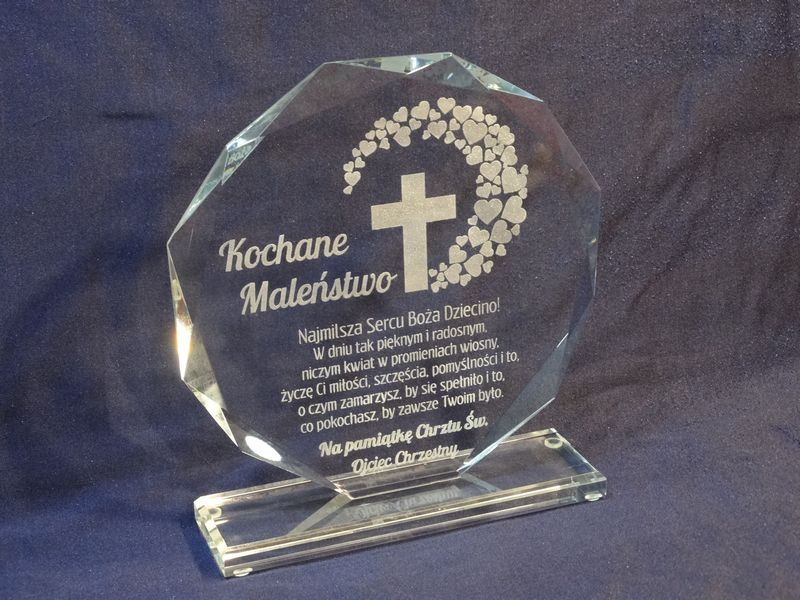 Statuetka szklana z grubego szkła w kształcie szlifowanego ośmioboku z grawerem dedykacji i ozdobnych grafik z okazji Chrztu Świętego.