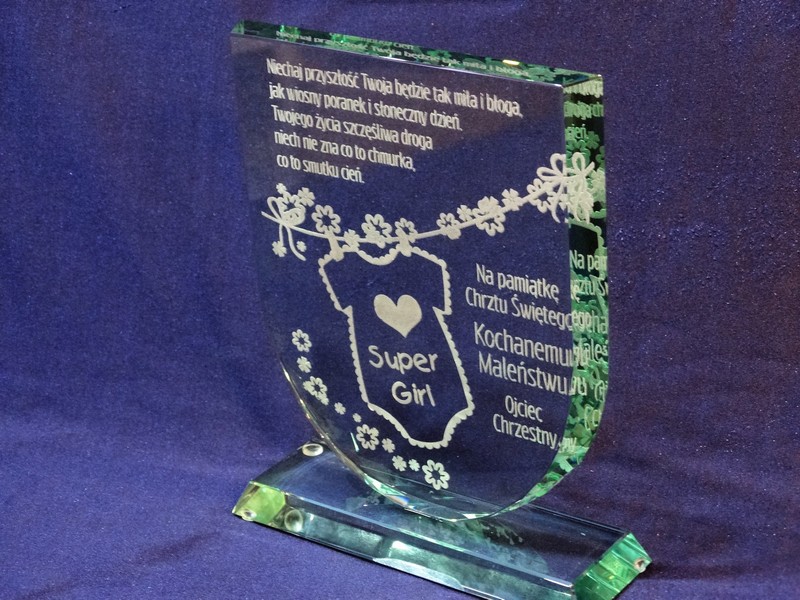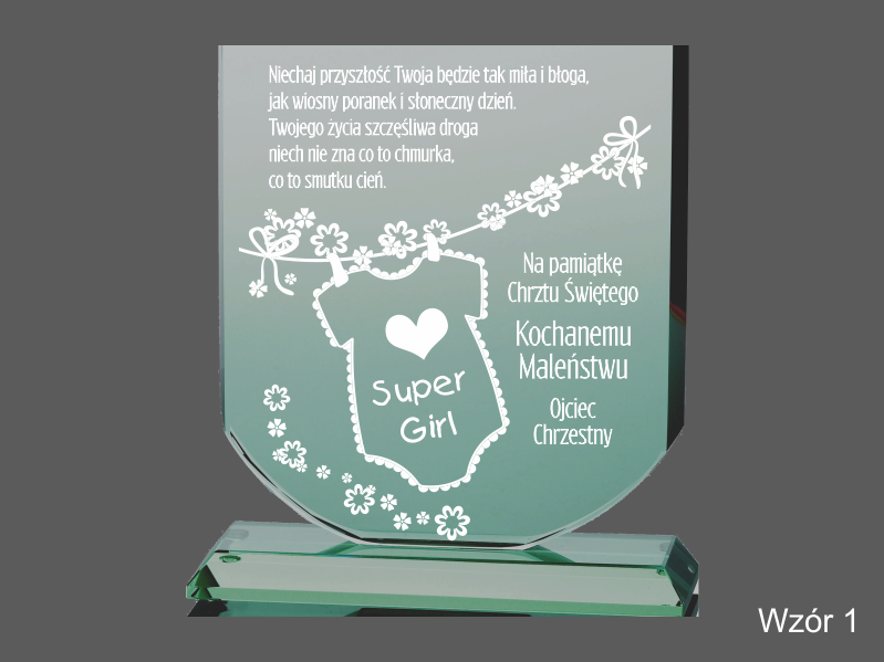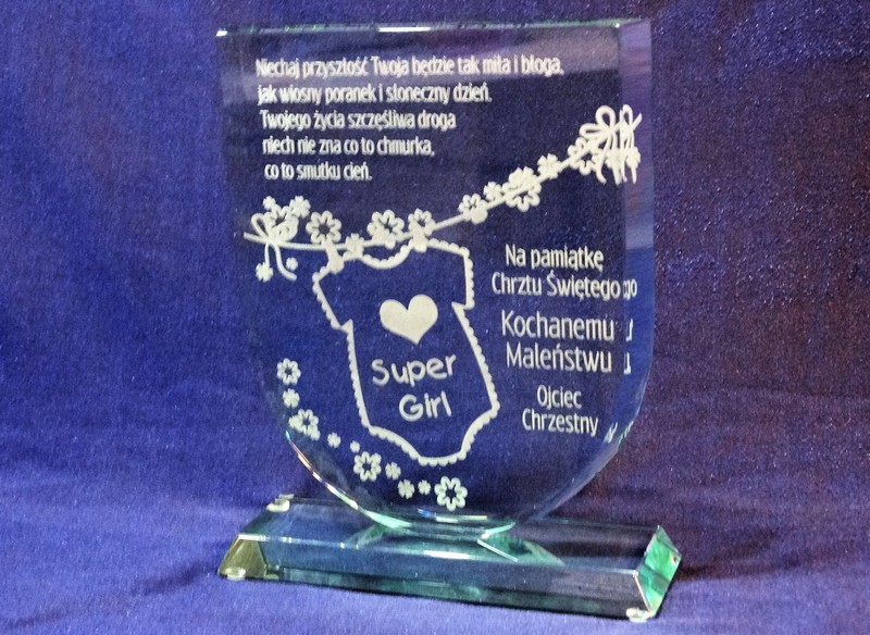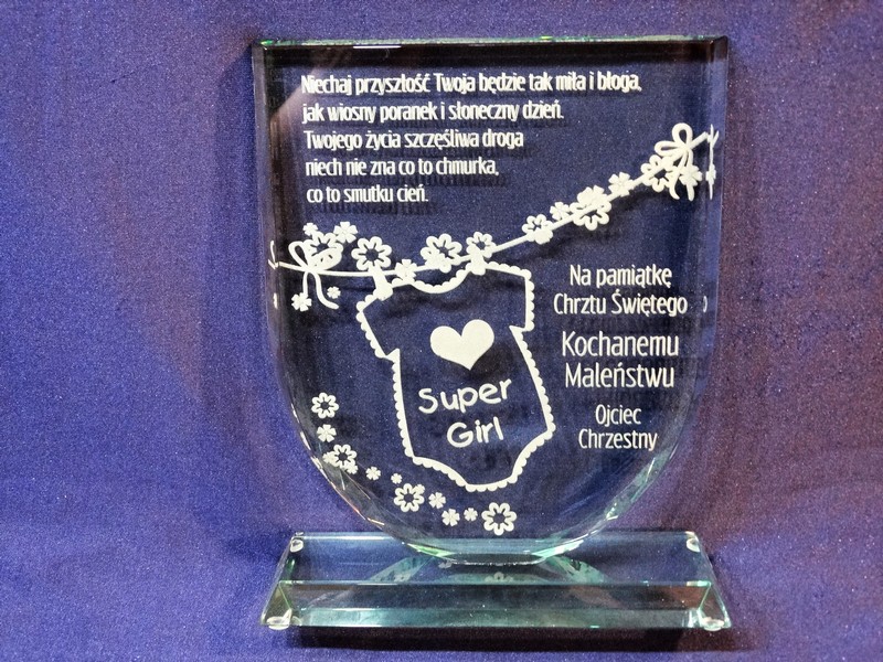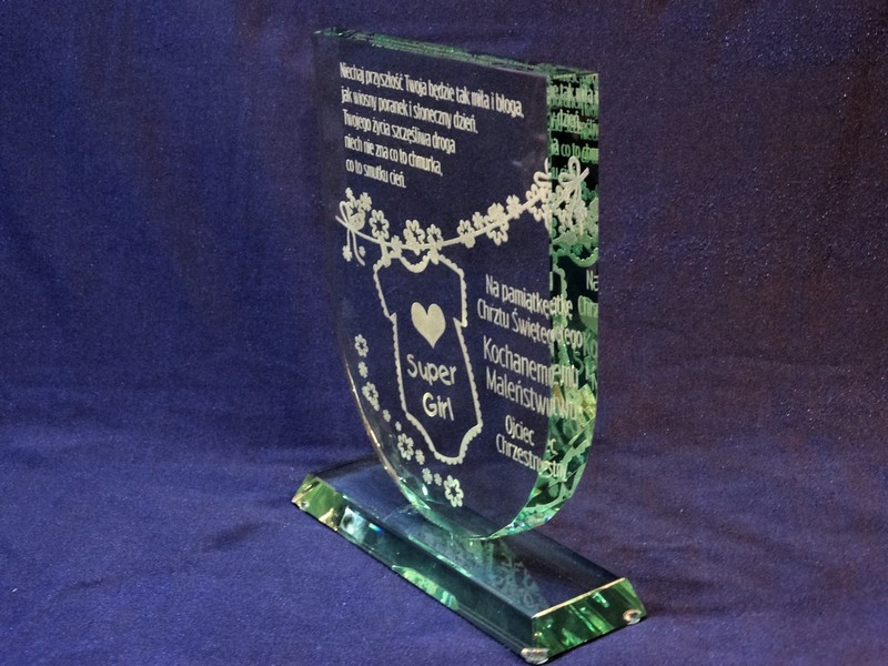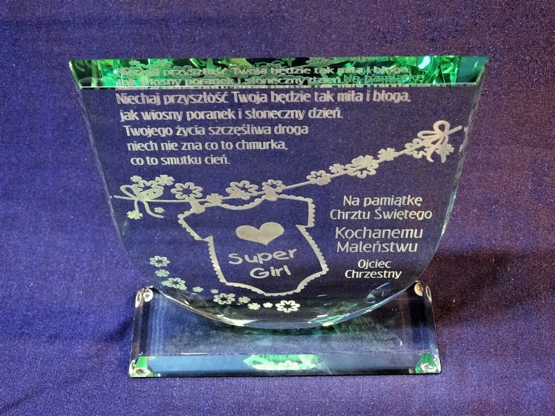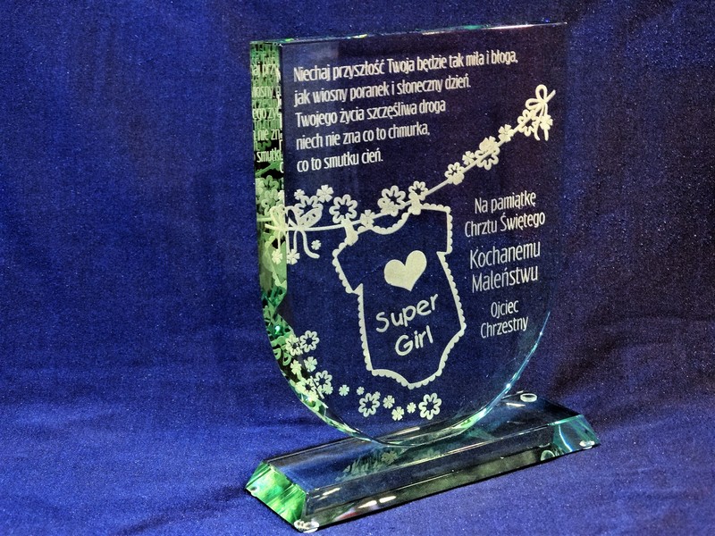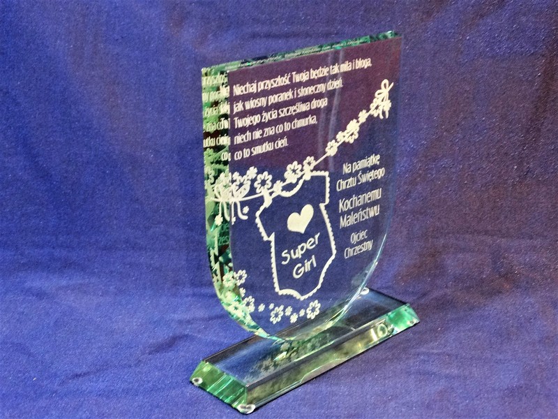Statuetka szklana z grubego szkła w kształcie tarczy z grawerem dedykacji i ozdobnych grafik z okazji Chrztu Świętego.