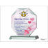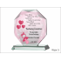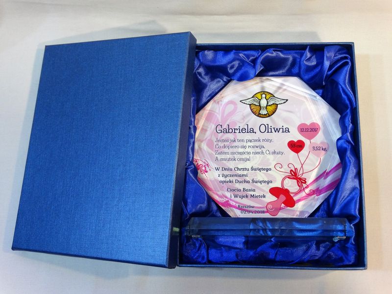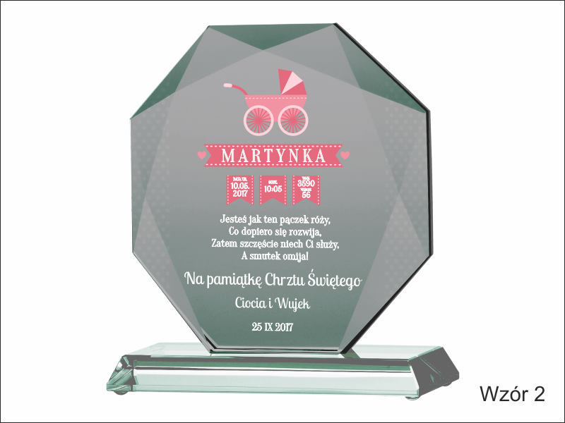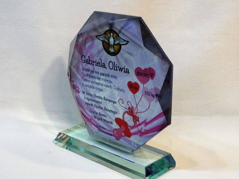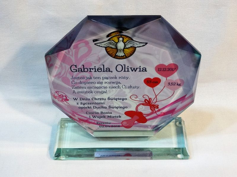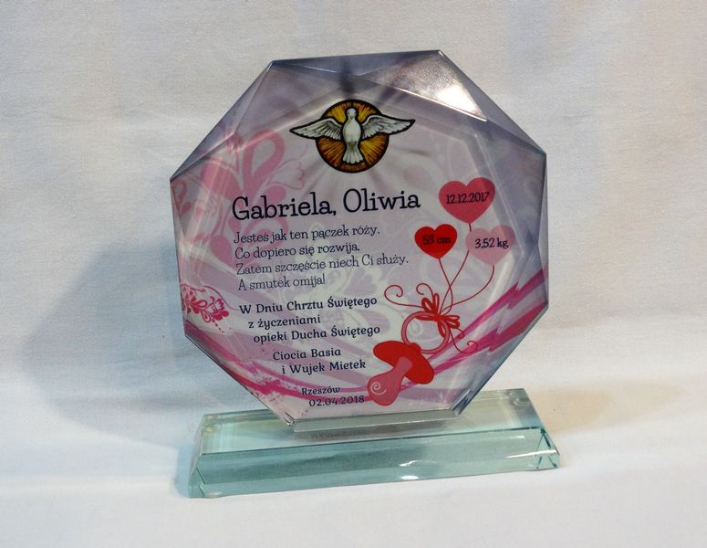 Statuetka szklana z grubego szkła w kształcie szlifowanego ośmioboku z nadrukiem dedykacji i ozdobnych grafik z okazji Chrztu Świętego.