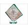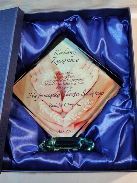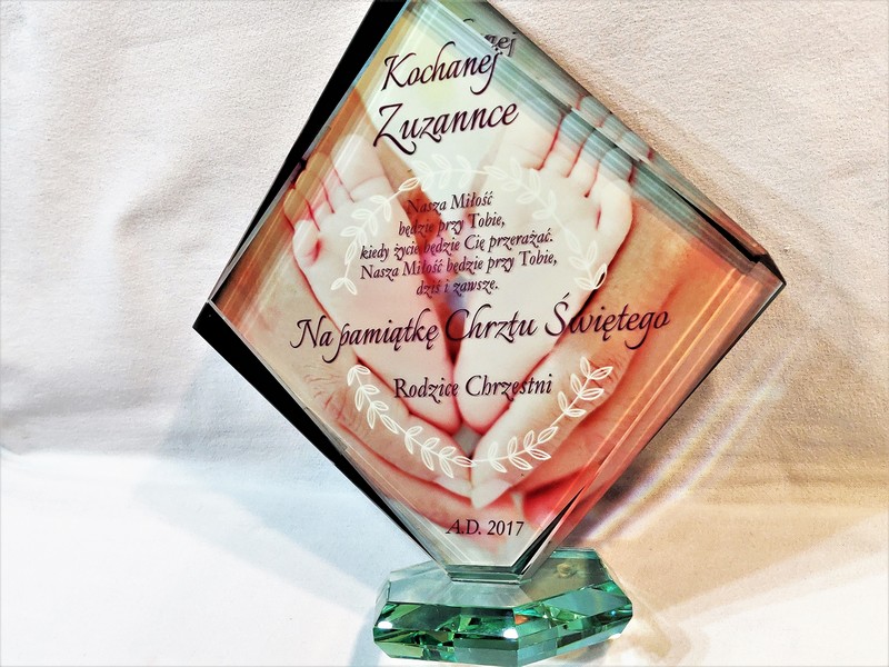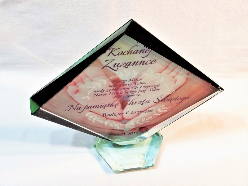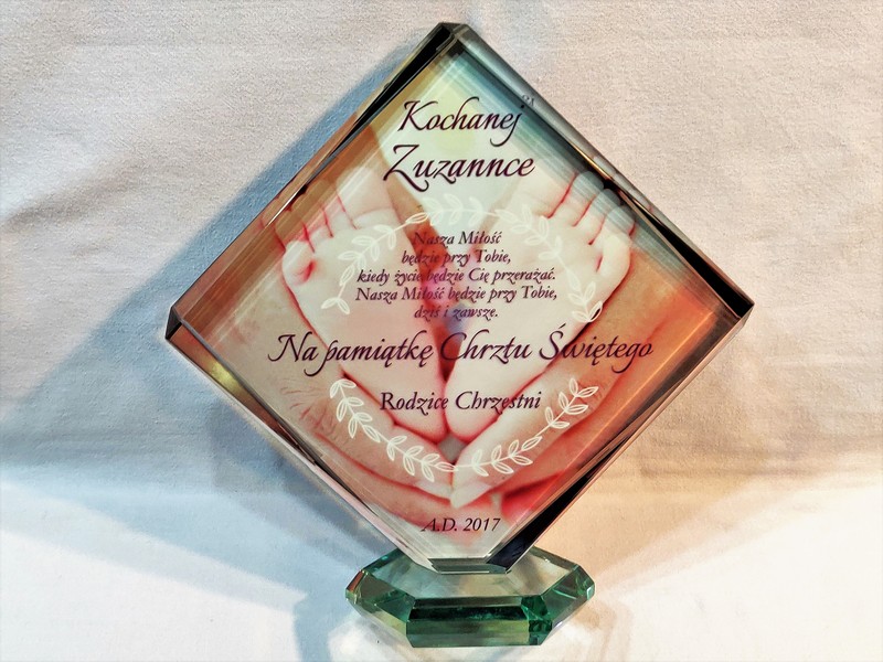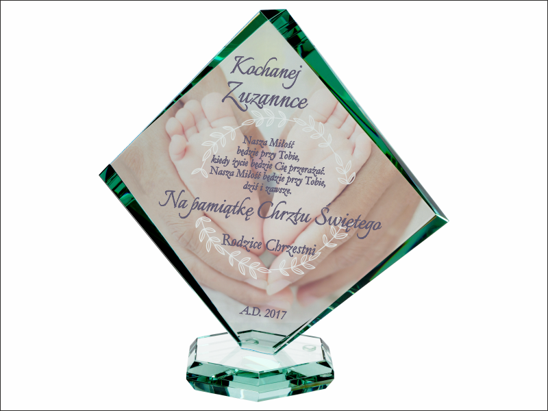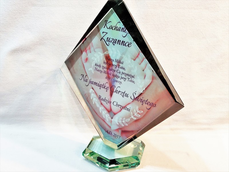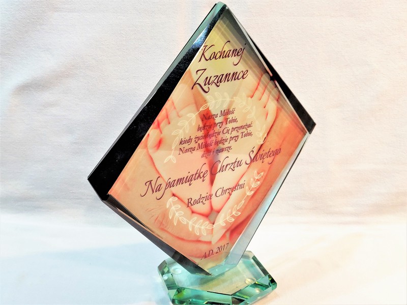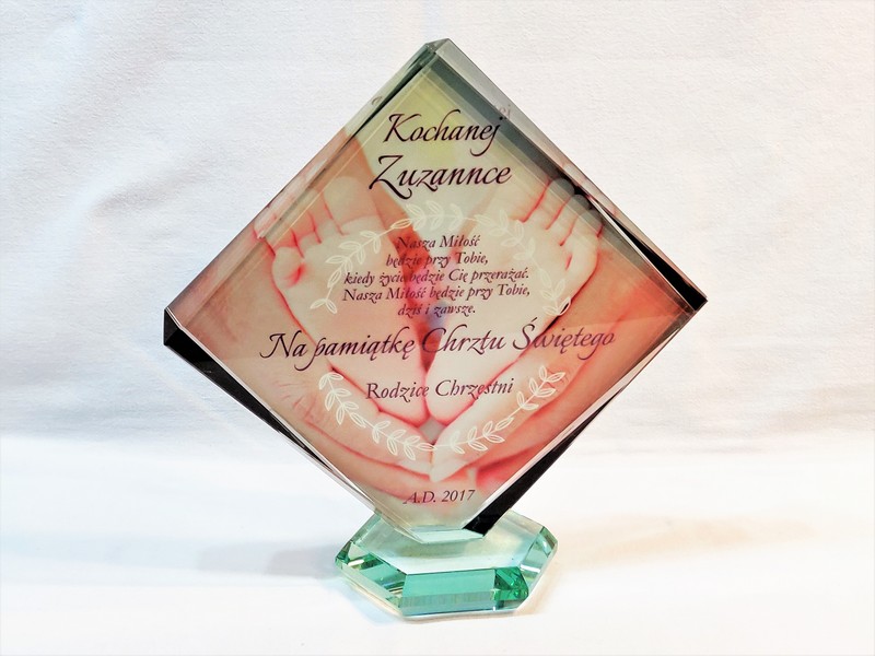 Statuetka szklana z grubego szkła w kształcie szlifowanego rombu z nadrukiem dedykacji i ozdobnych grafik z okazji Chrztu Świętego.