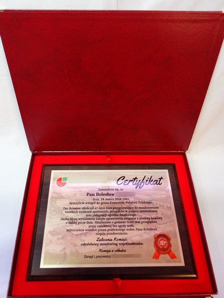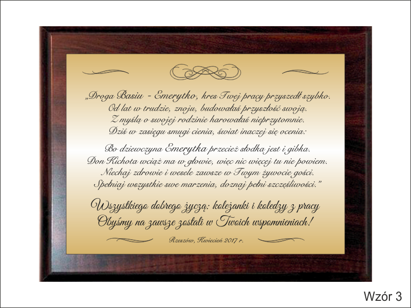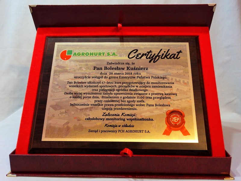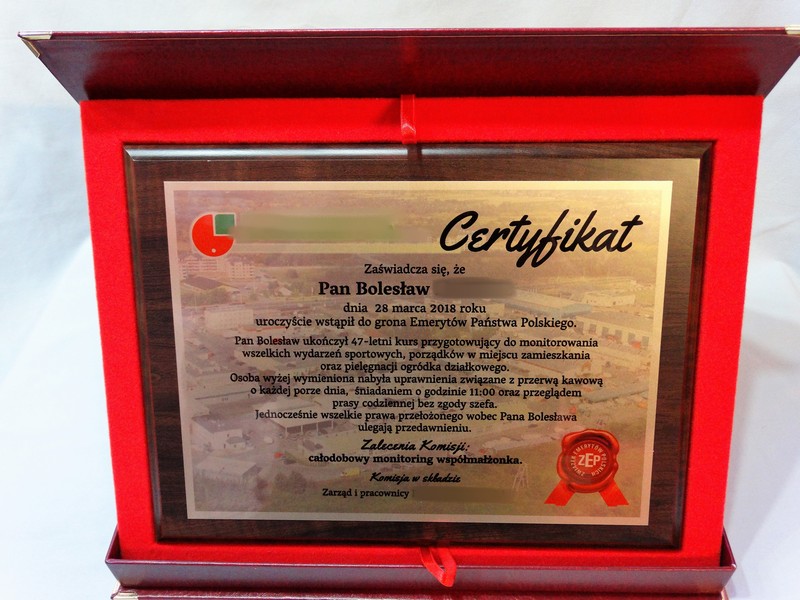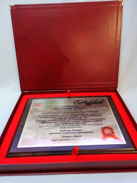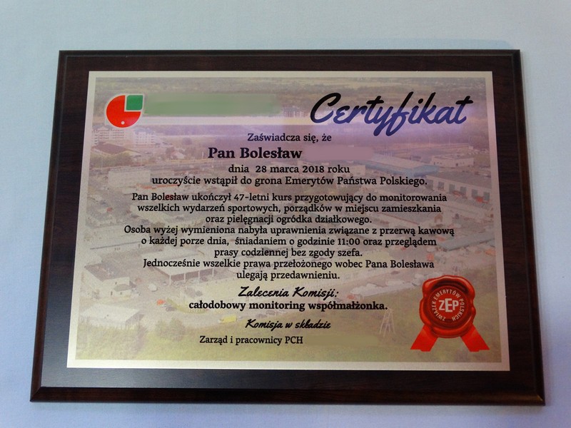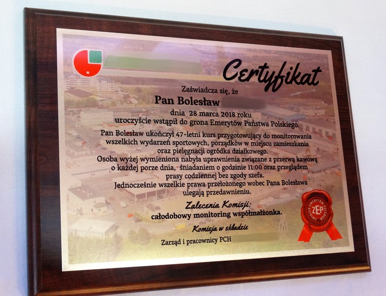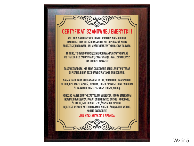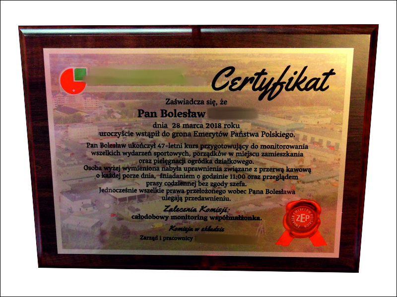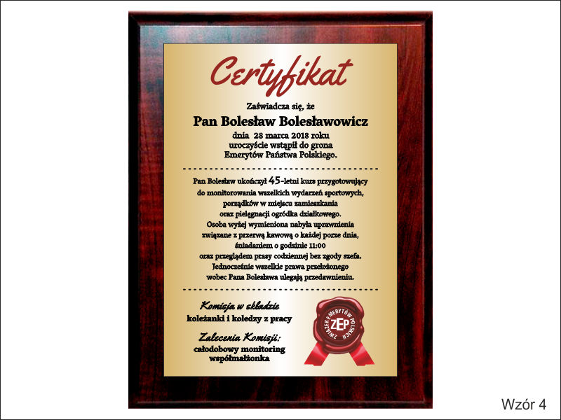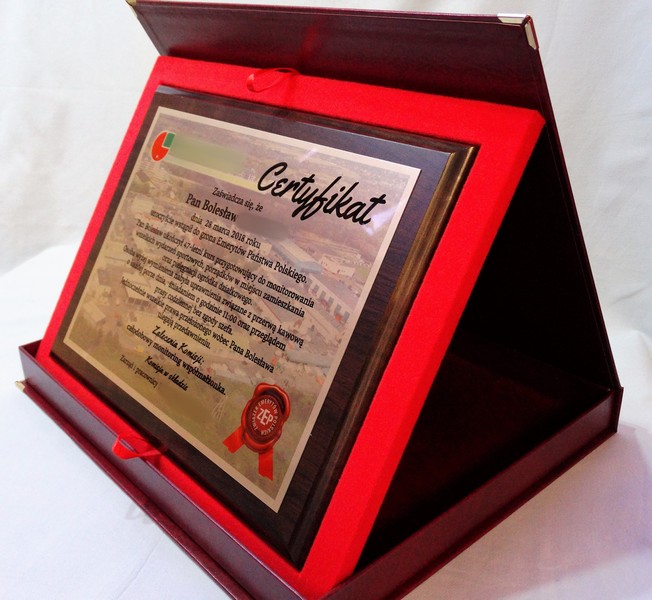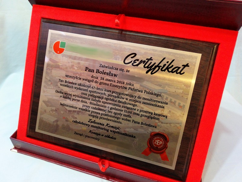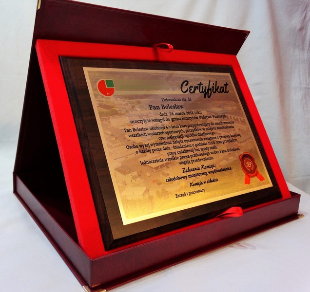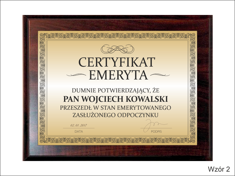 Certyfikat Emeryta w postaci dyplomu okolicznościowego na drewnianym podkładzie z blaszką z nadrukiem.