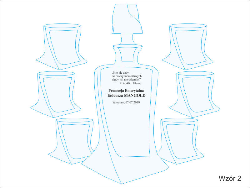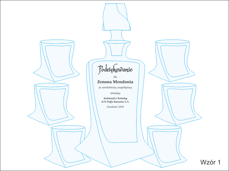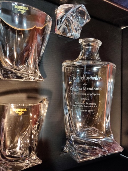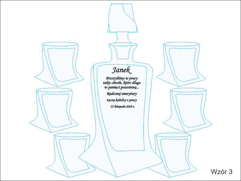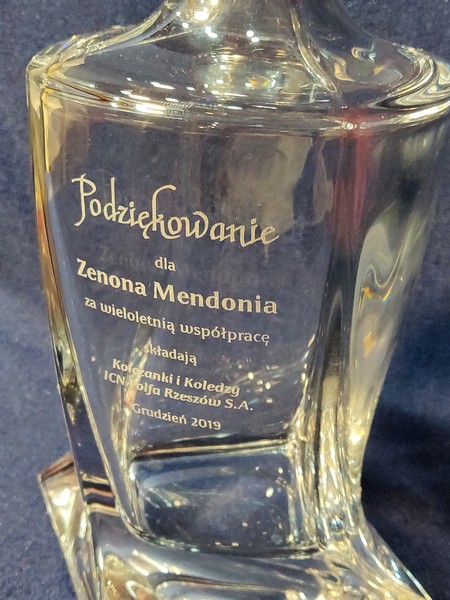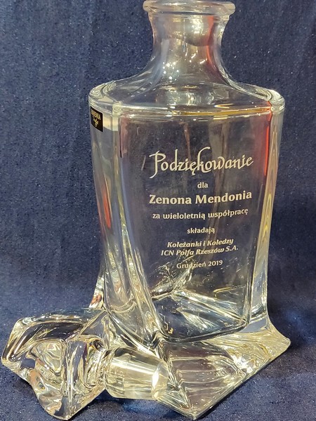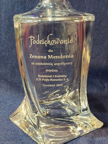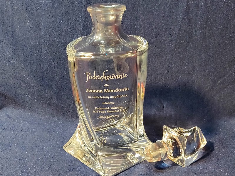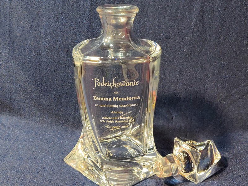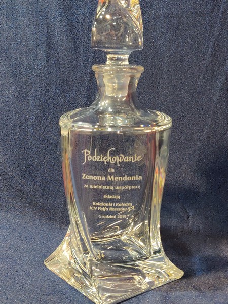 Na karafce wykonany jest pamiatkowy grawer dedykacji z okazji zakończenia pracy i przejścia na emeryturę.