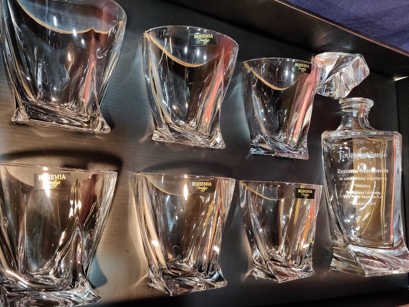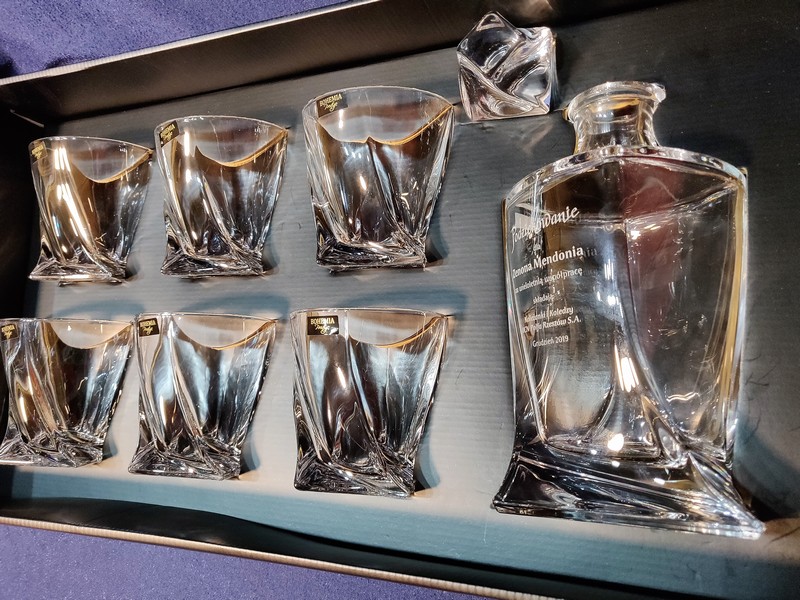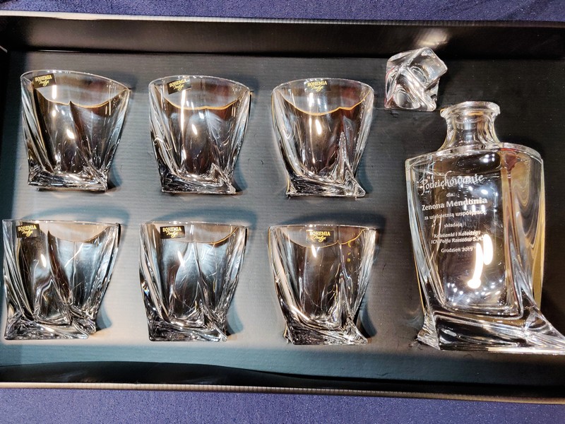 Pamiątkowy upominek z okazji przejścia na emeryturę w postaci kryształowego kompletu do whisky z grawerem.