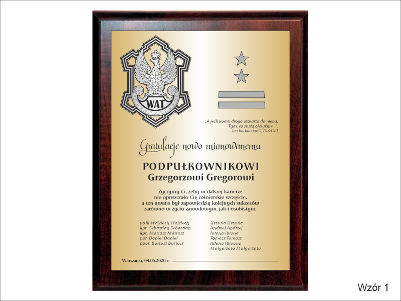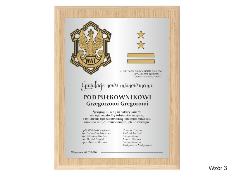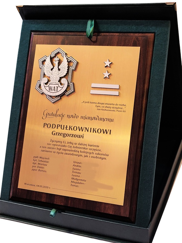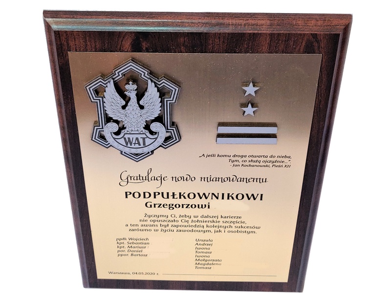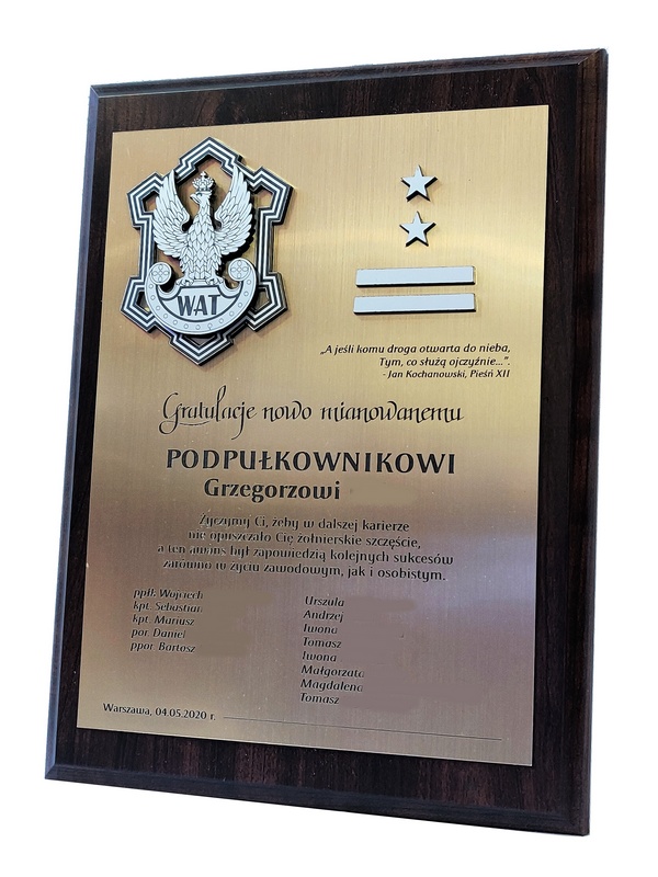 Gratulacje z okazji awansu na wyższy stopień w postaci ryngrafu drewnianego na standardowym podkładzie.