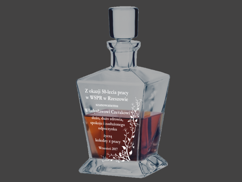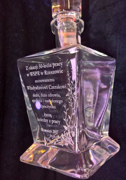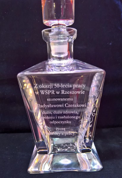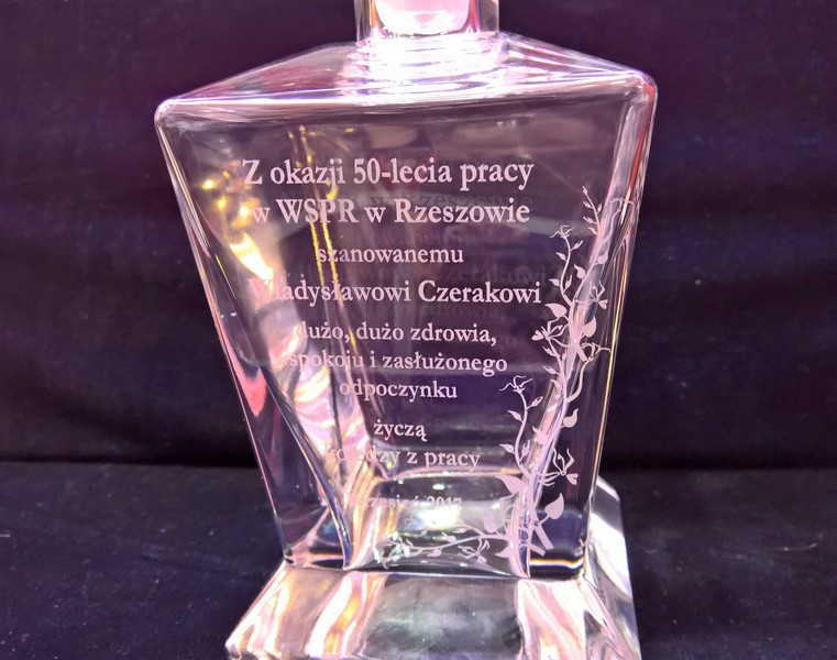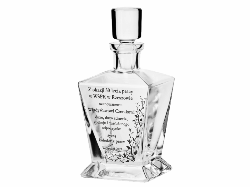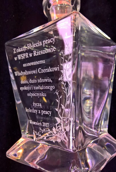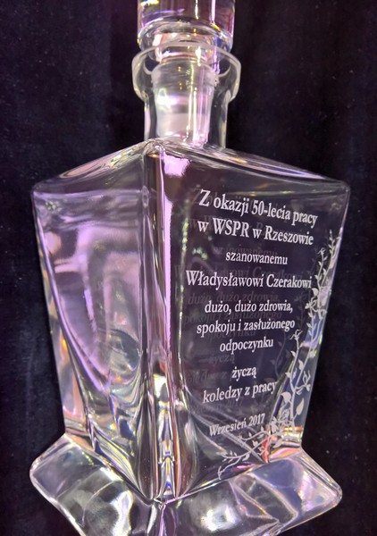Na powierzchni karafki wykonujemy grawer dedykacji z okazji jubileuszu pracy.