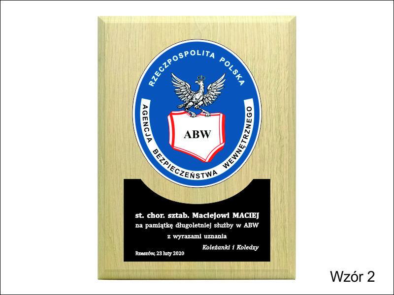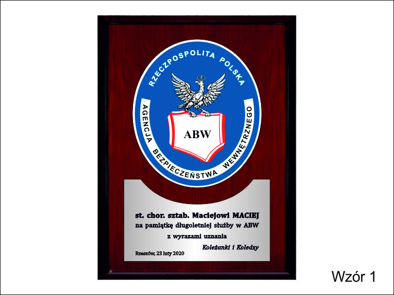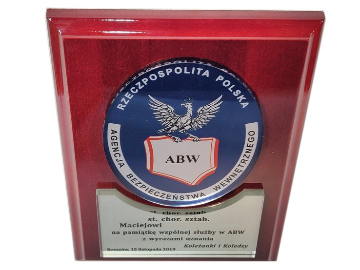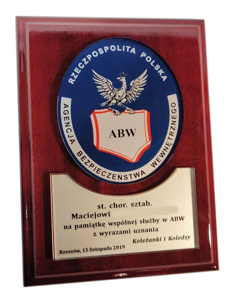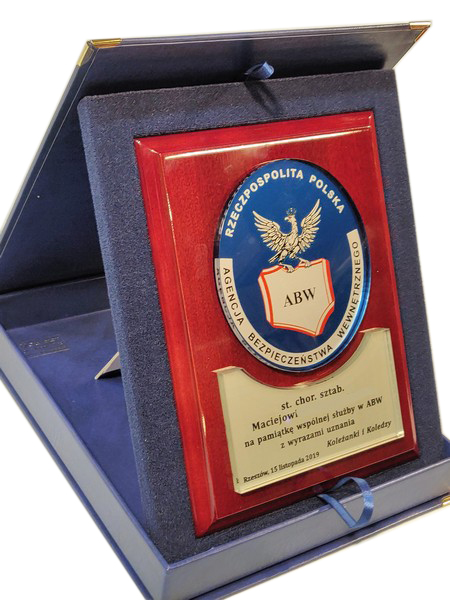 - z umieszczonej pod odznaką bezbarwnej pleksi z nadrukiem pamiatkowej dedykacji,