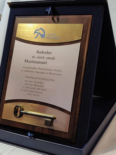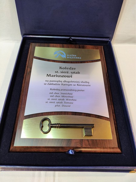 Pamiątka wspólnej służby lub pracy w postaci drewnianego dyplomu okolicznościowego z wpasowanym żeliwnym kluczem.