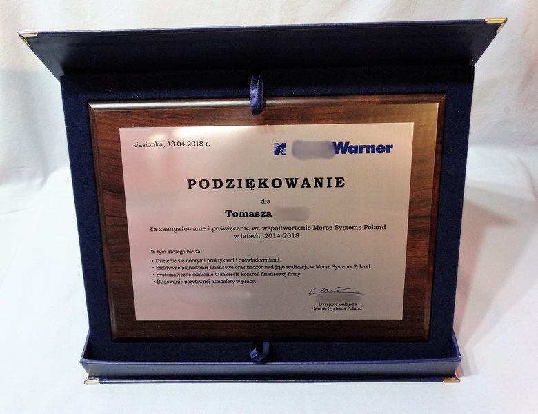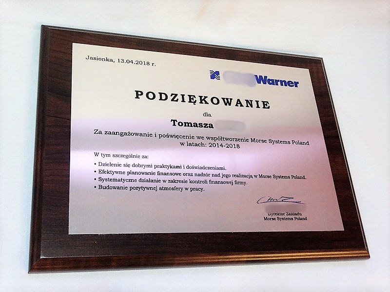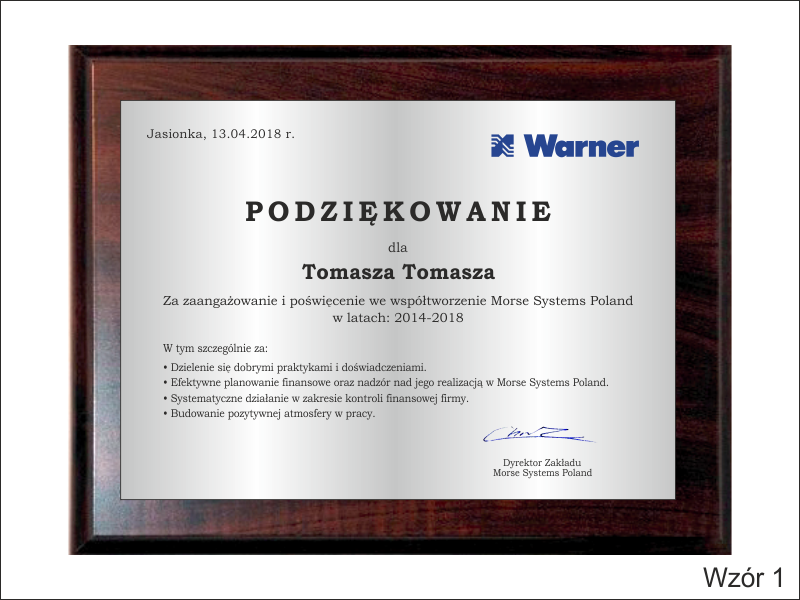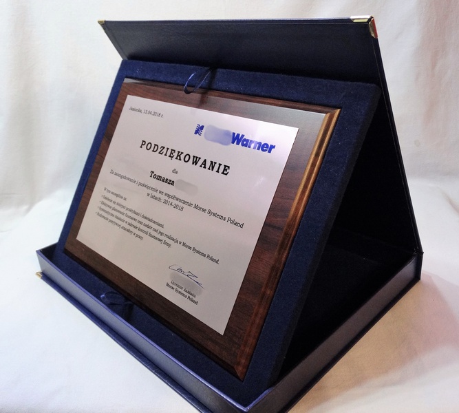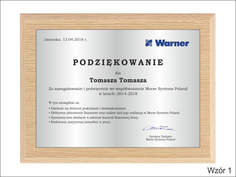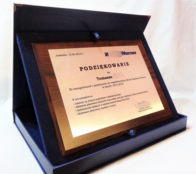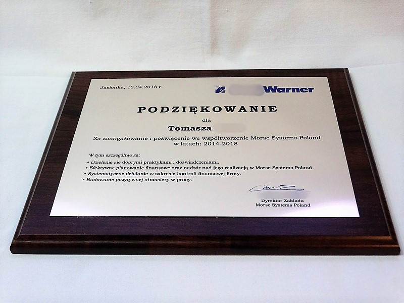 Podziękowanie za pracę w formie drewnianego dyplomu okolicznościowego na drewnianym standardowym podkładzie z blachą z nadrukiem.