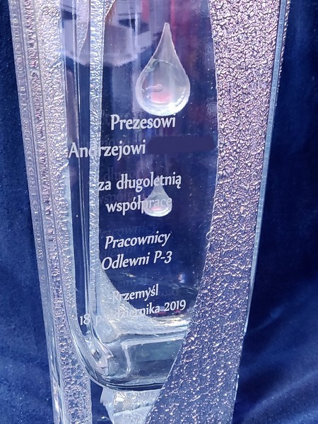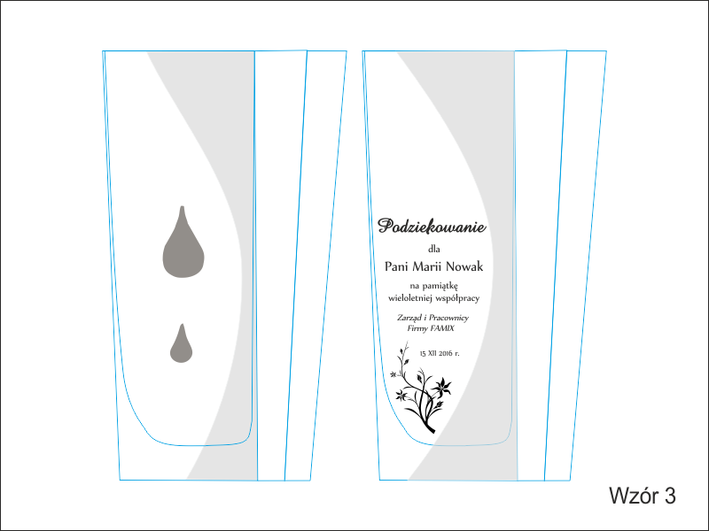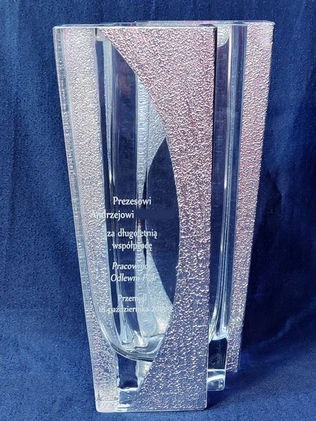Na wazonie wykonany jest grawer ozdobnych grafik, loga i dedykacji z podziękowaniem za wspólną pracę lub na pamiątkę wspólnej pracy.