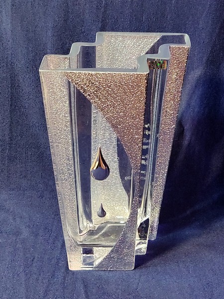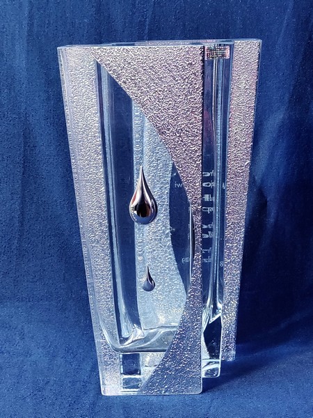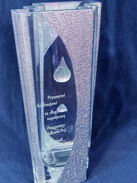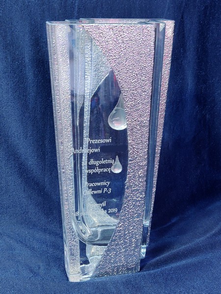 Podziękowanie za pracę w postaci wazonu szklanego Emanuel zdobionego srebrnymi kroplami i grawerem dedykacji.