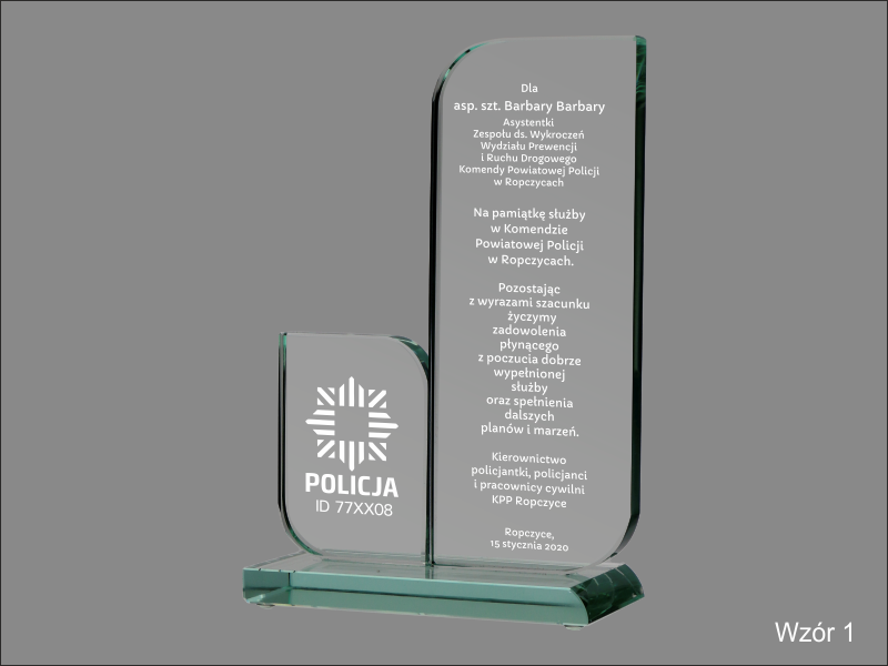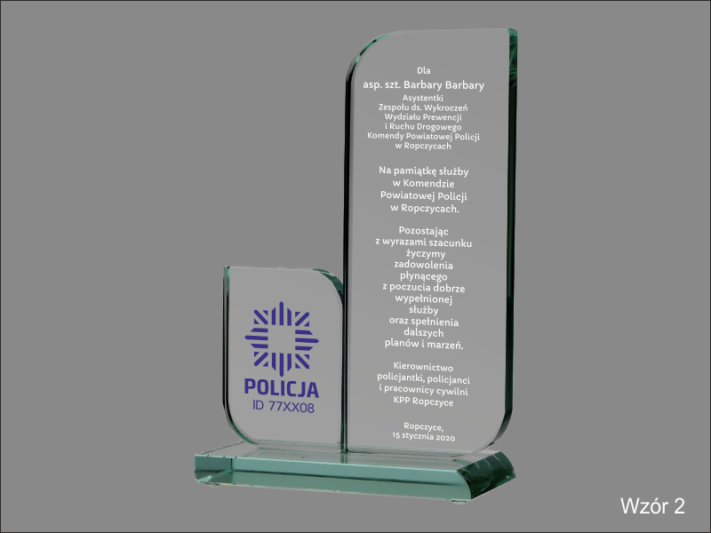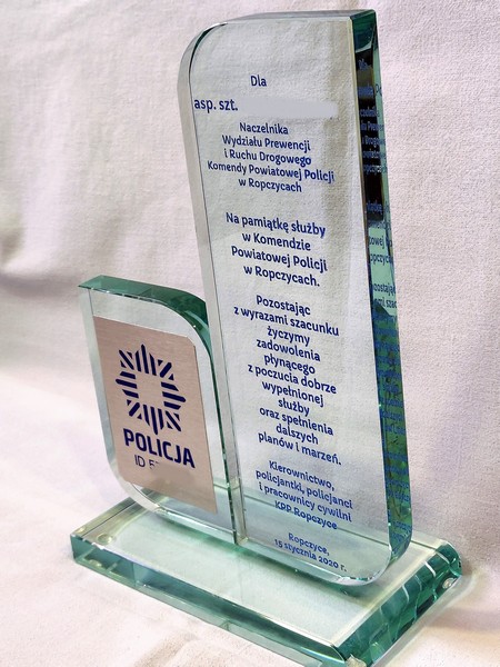 Grawer z okazji zakończenia służby czy emerytury można wykonać także na innych modelach statuetek szklanych.