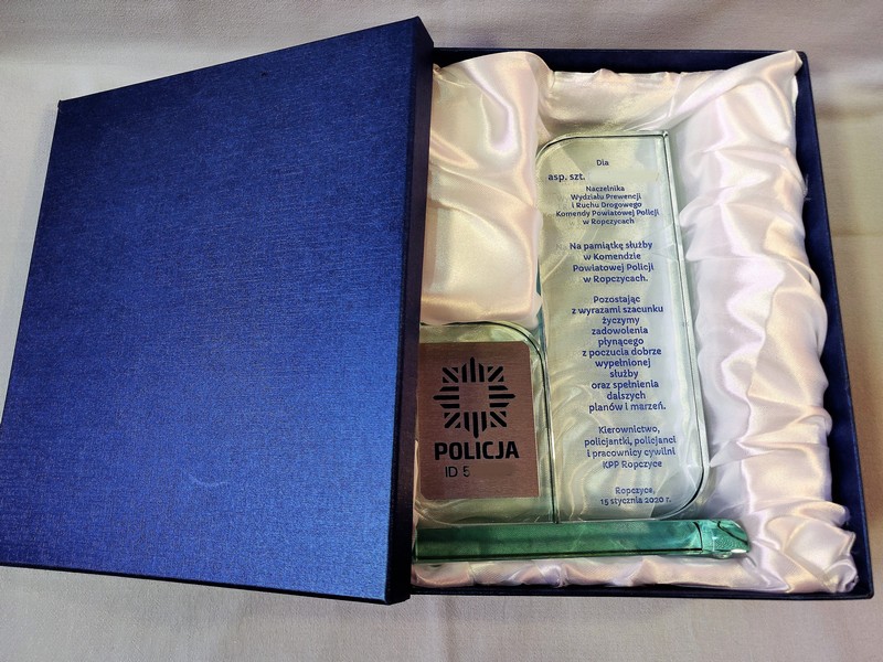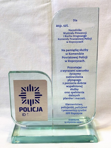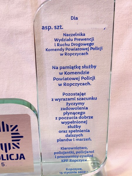 Na statuetce wykonany jest grawer okolicznościowej dedykacji z podziękowaniem za wspólnie wykonywaną służbę.