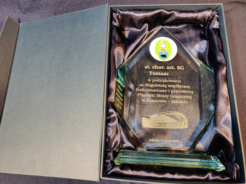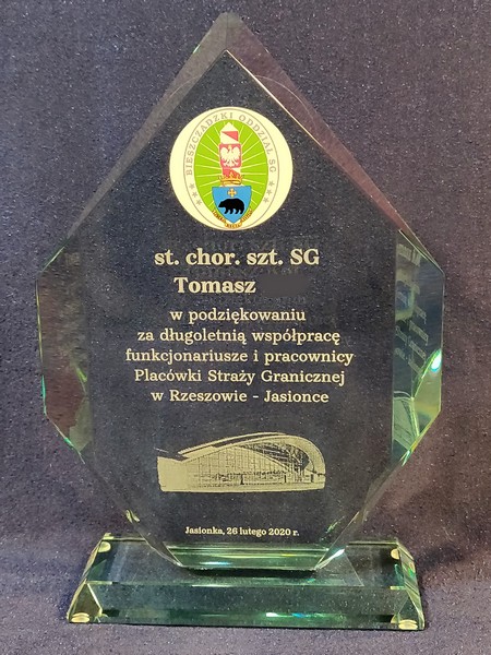 Na statuetce wykonany jest grawer okolicznościowej dedykacji z podziękowaniem za współpracę i służbę.