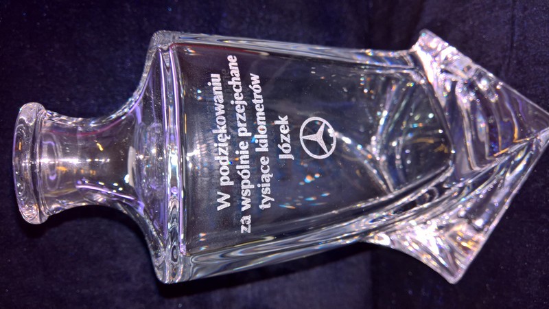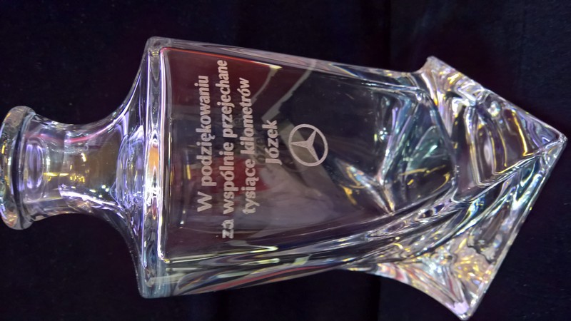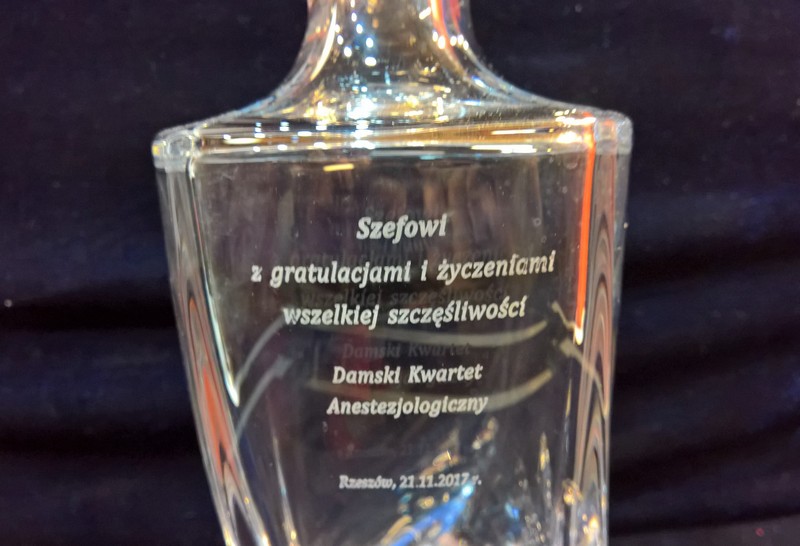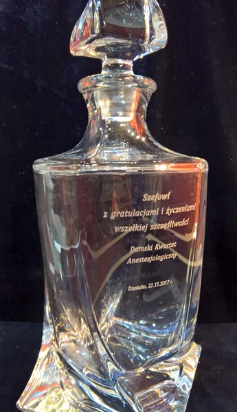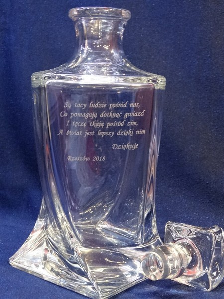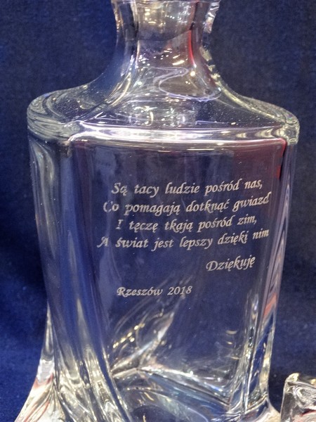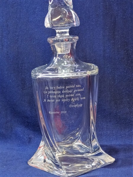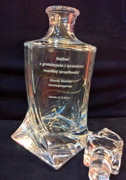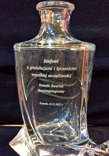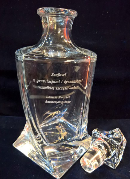 Na powierzchni karafki wykonany jest grawer okolicznościowej dedykacji na pamiątkę wspólnej pracy.