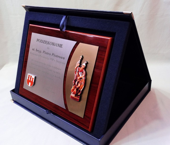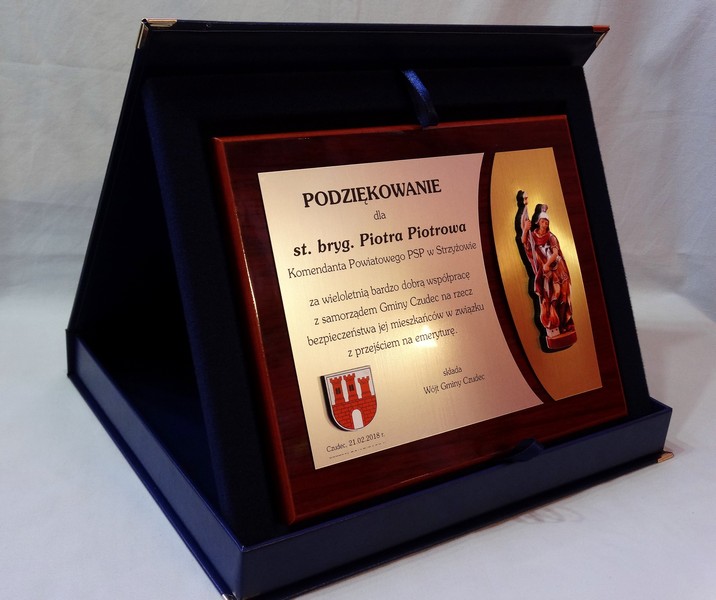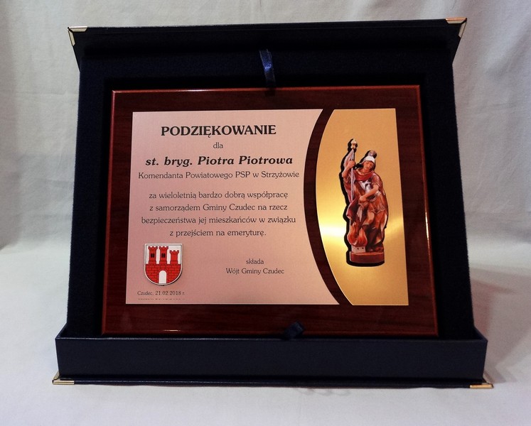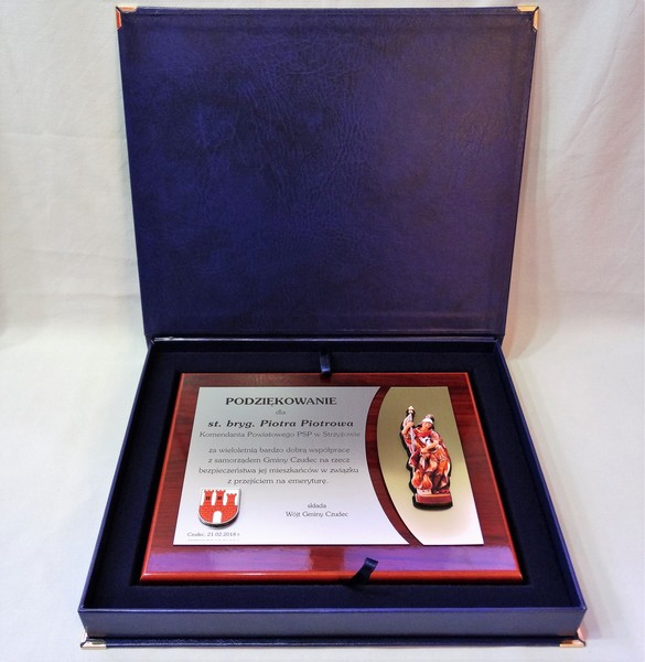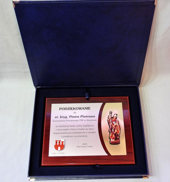 Podziękowanie za współpracę dla Strażaka z okazji przejścia na emeryturę w postaci złożonego dyplomu okolicznościowego.
