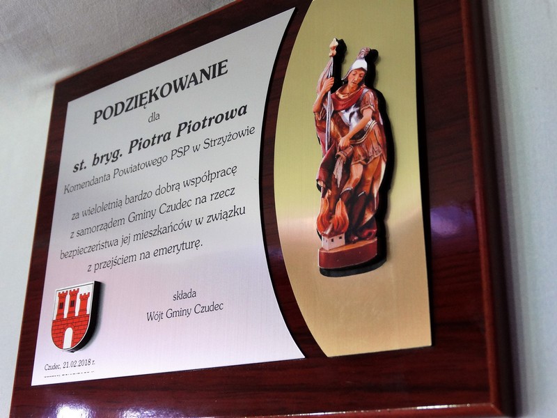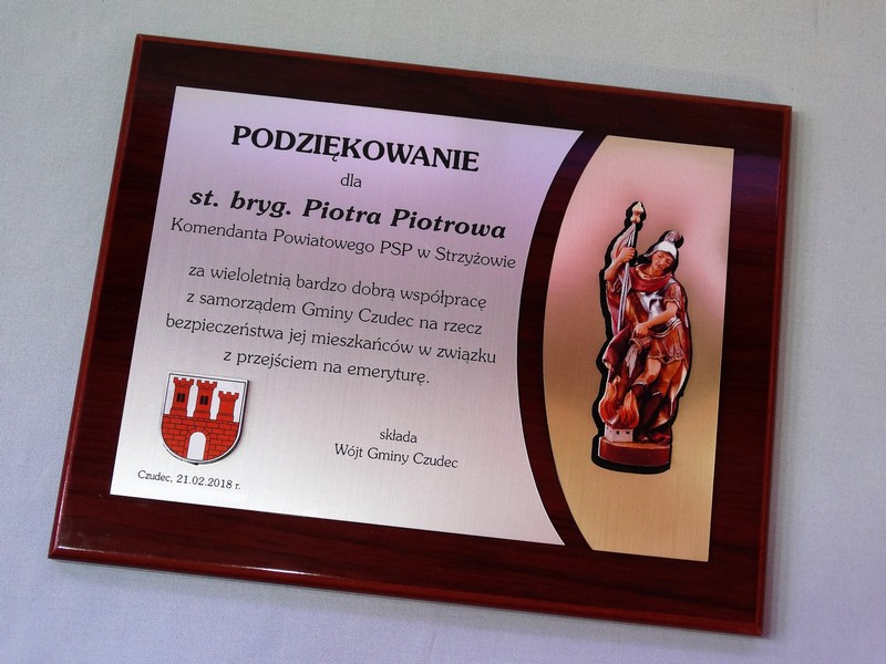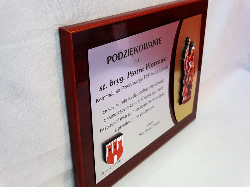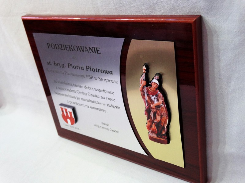 Dodatkowe elementy: figurka Św.Floriana oraz herb nadrukowane są na przyciętych na odpowiedni kształt laminatach.
