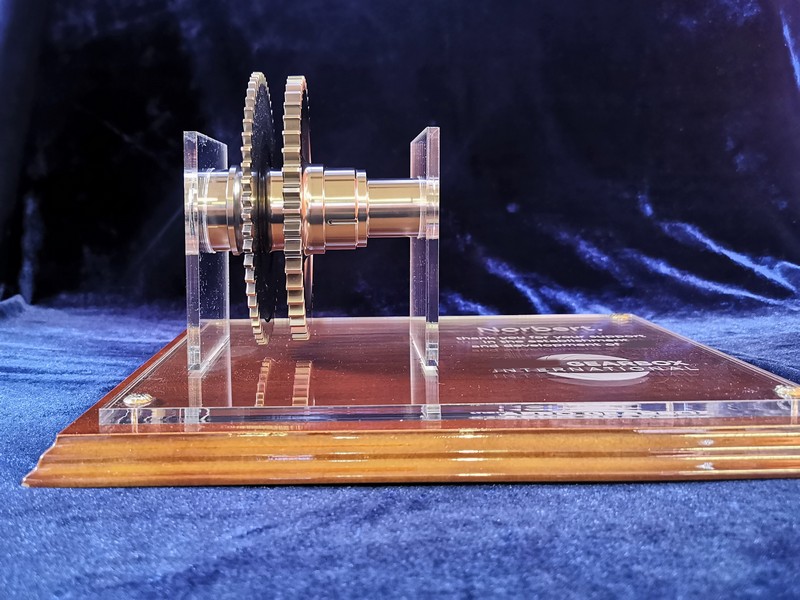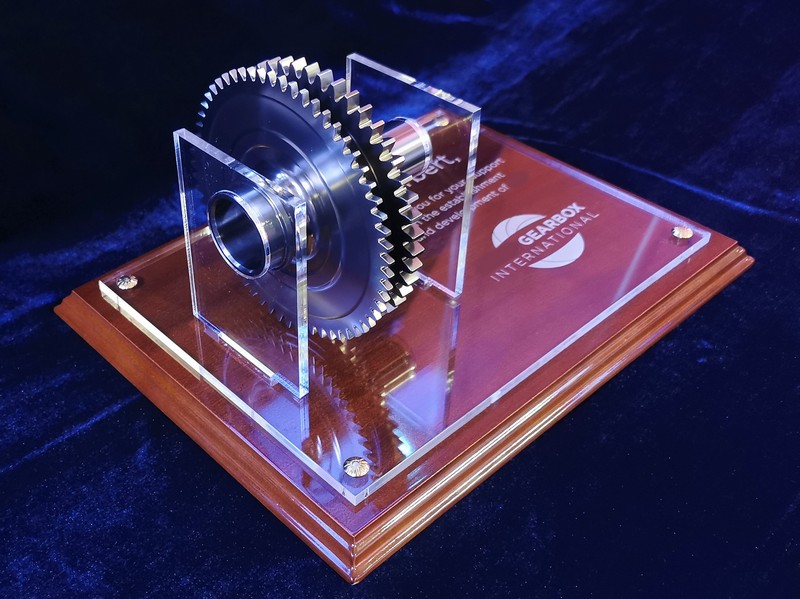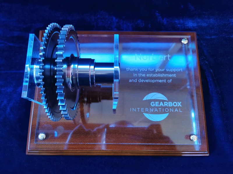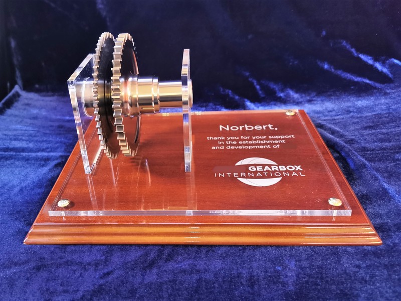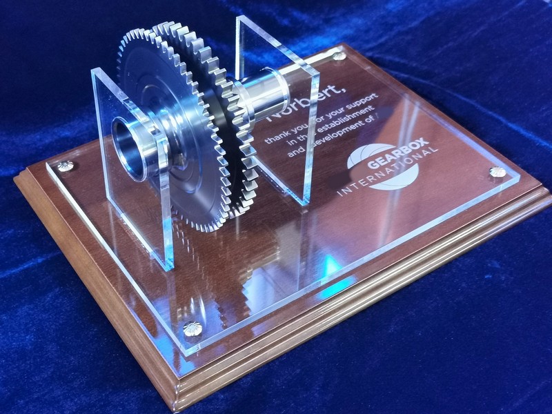 Tuleja z zębatkami zamontowana jest na pionowych uchwytach z pleksy osadzonych następnie w pleksie z grawerowaną dedykacją, która jest przytwierdzona do podkładu drewnianego.