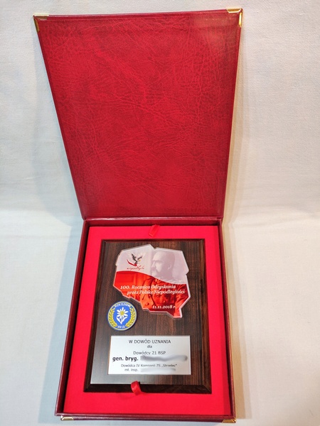 Pamiątkowy Ryngraf w postaci dyplomu drewnianego na standardowym podkładzie, składający się: