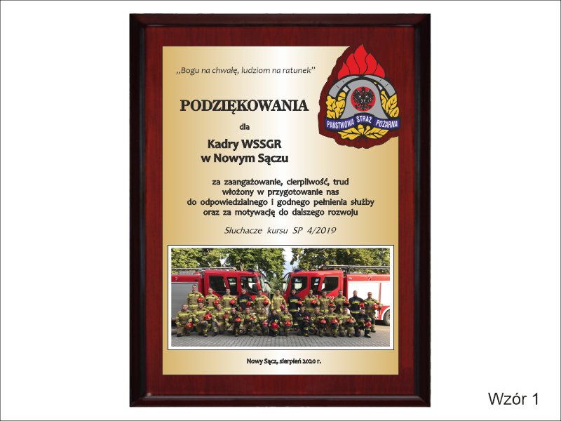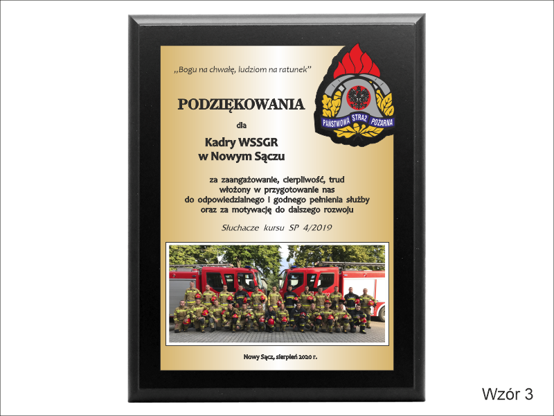 - z laminatu z wygrawerowaną dedykacją i wyciętym miejscem na odznakę,