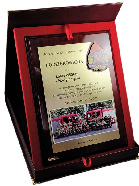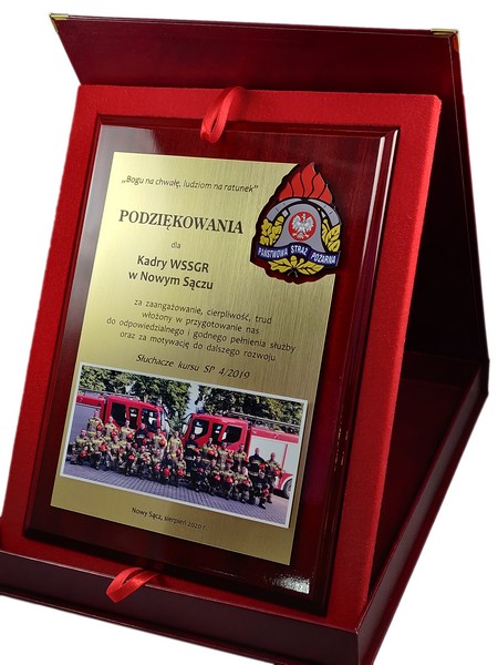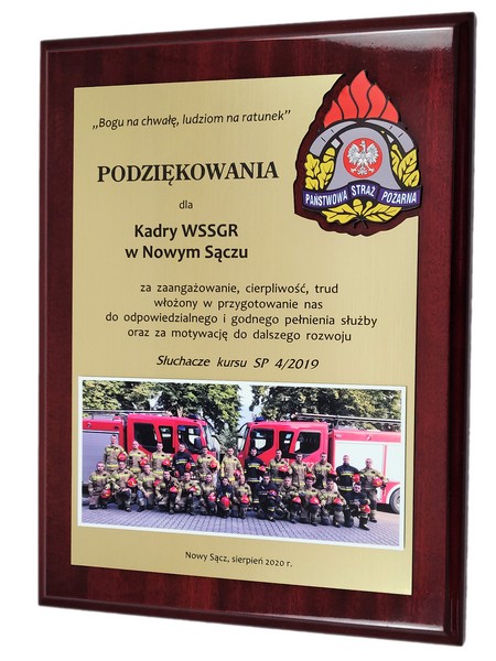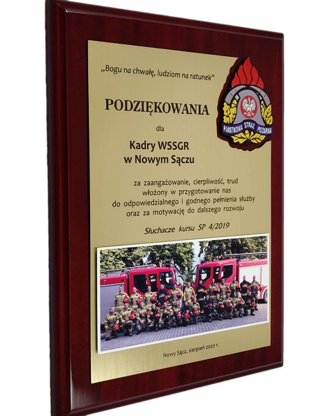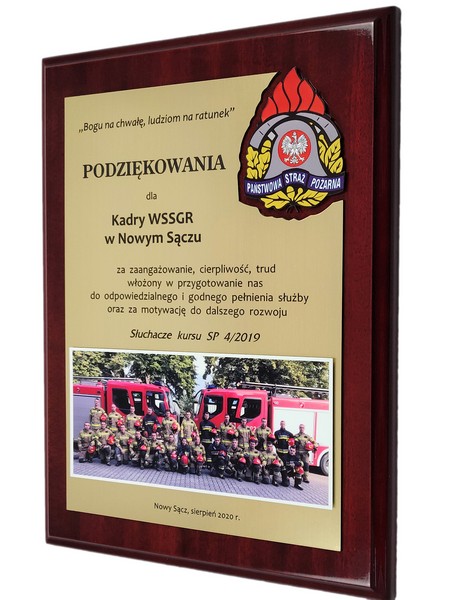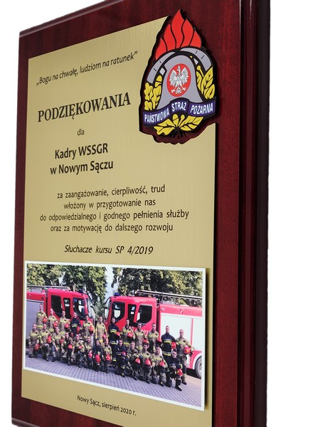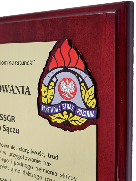 Podziękowania od strażaków w postaci pamiątkowego drewnianego dyplomu okolicznościowego.