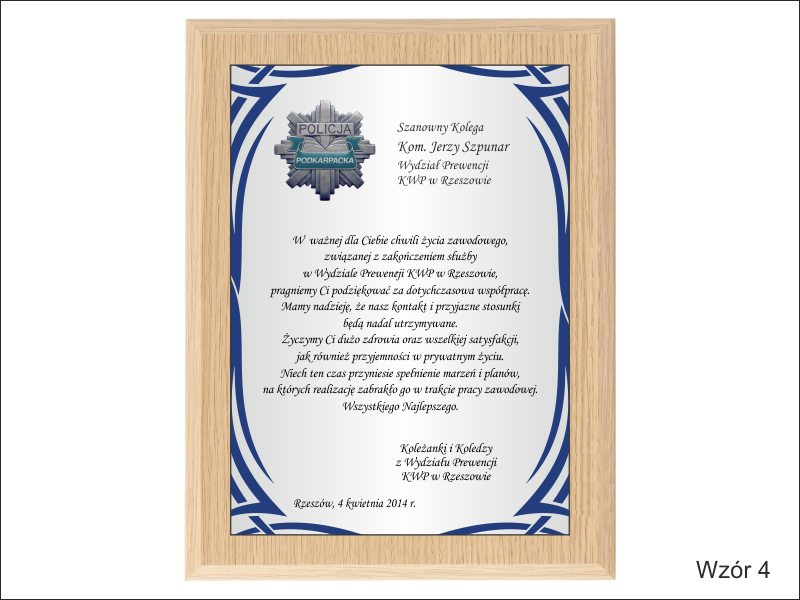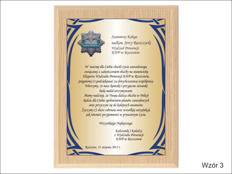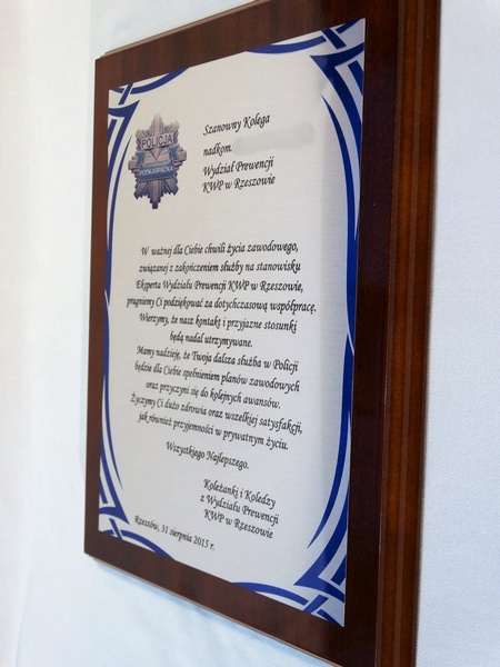 Pożegnalny, na pamiątkę i zakończenie wspólnej służby dyplom drewniany z blachą z nadrukiem na standardowym podkładzie