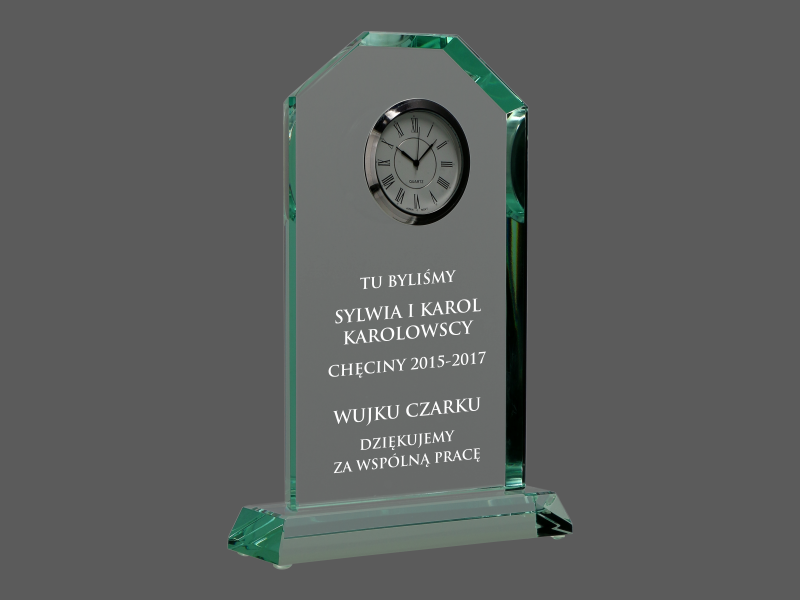 Statuetka szklana G029 z grubego szkła w kształcie szlifowanego trapezu z zegarkiem,
