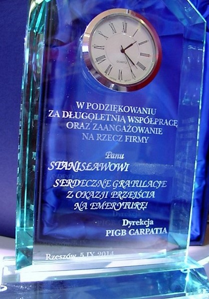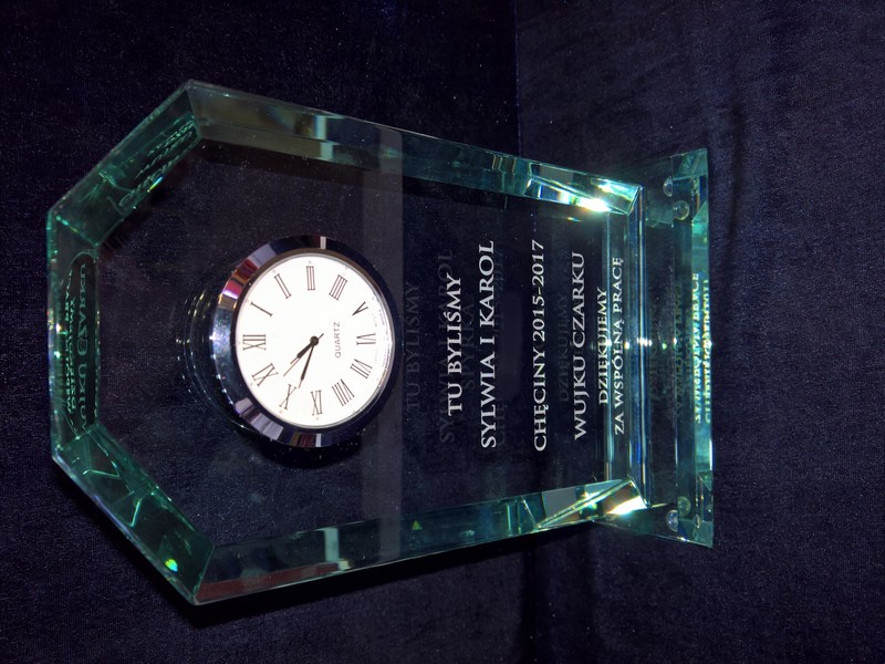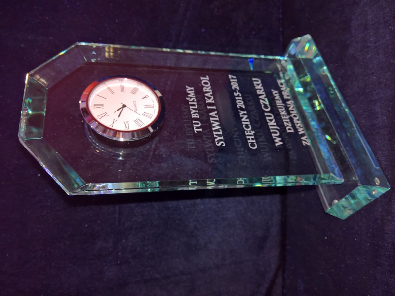 z grawerem dedykacji, grafik lub loga z podziękowaniem za staż pracy.