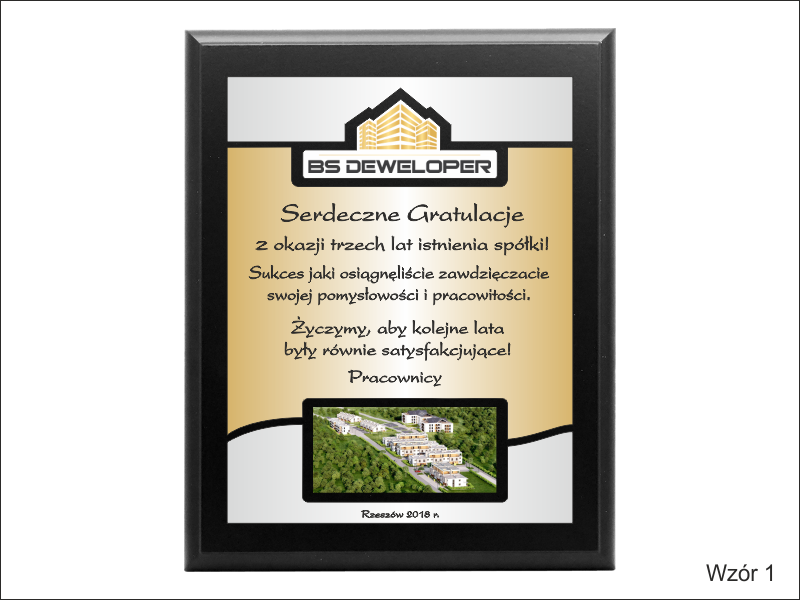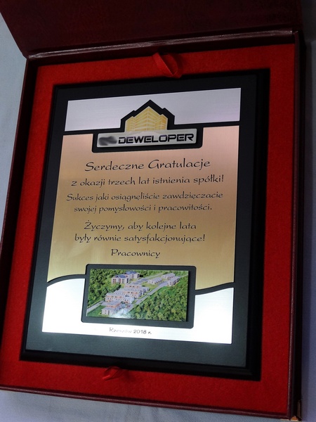 Gratulacje z okazji jubileuszu firmy w postaci złożonego dyplomu okolicznościowego na lakierowanym podkładzie, składającego się: