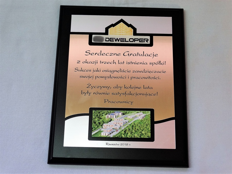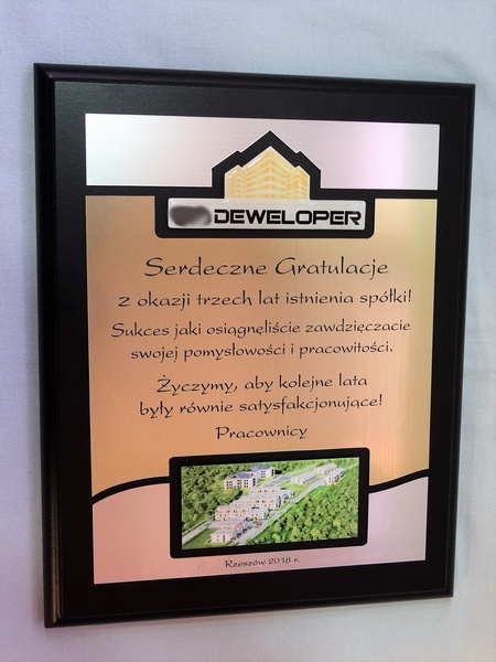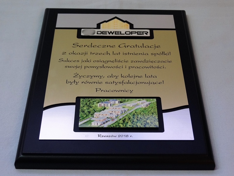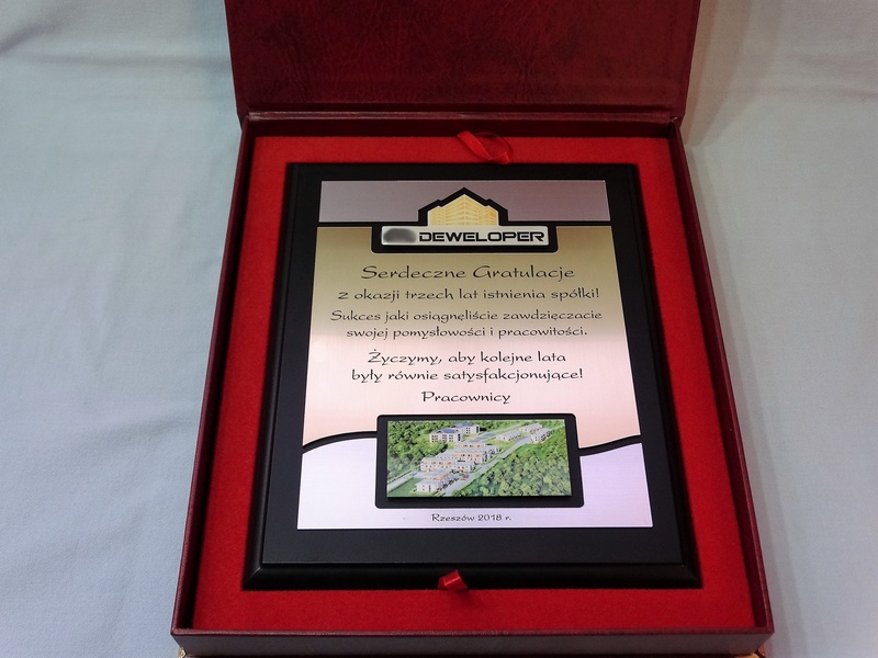 - z dopasowanych do siebie laminatów z wygrawerowaną dedykacją i wkomponowanym miejscem na logotyp i zdjęcie,