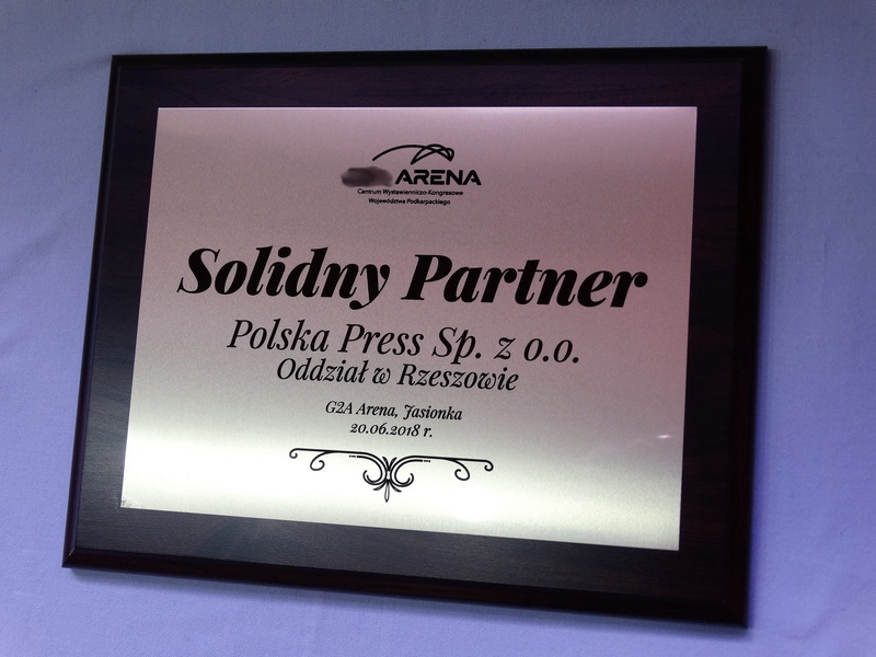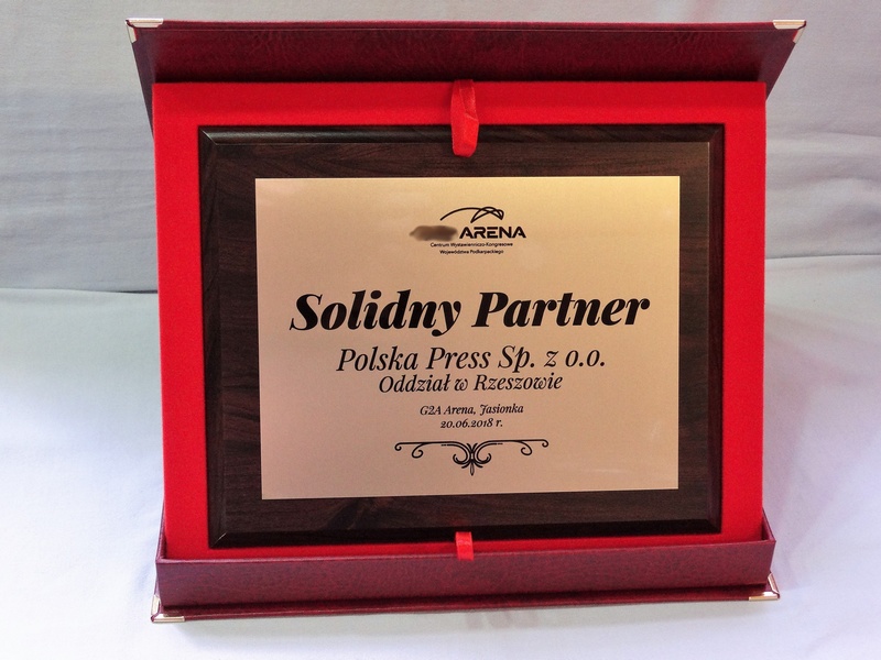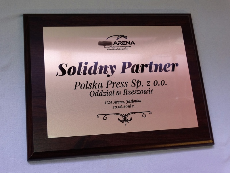 Wyróżnienie dla firmy w postaci dyplomu okolicznościowy na drewnianym podkładzie z blaszką z nadrukiem lub laminatem z grawerem.