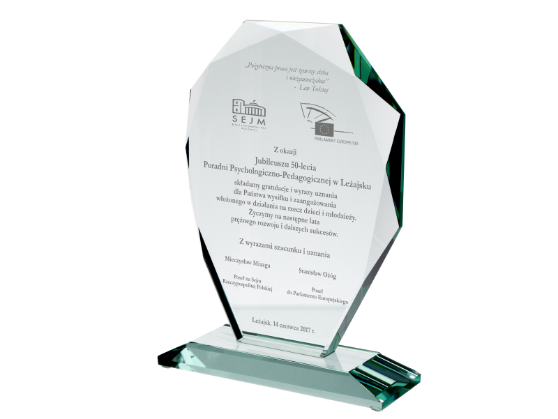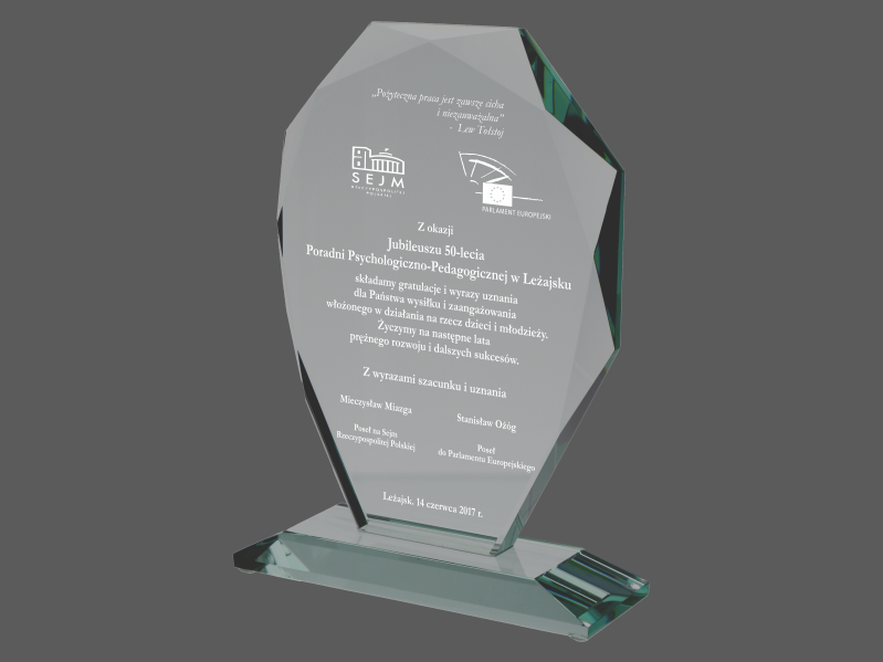 Prezentowana statuetka dedykowana jest na jubileusz działalności, ale można wykonać ją także na inne okazje.Grawer z okazji jubileuszu można wykonać także na innych modelach statuetek szklanych.