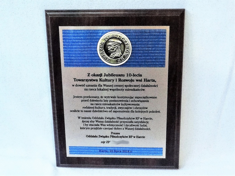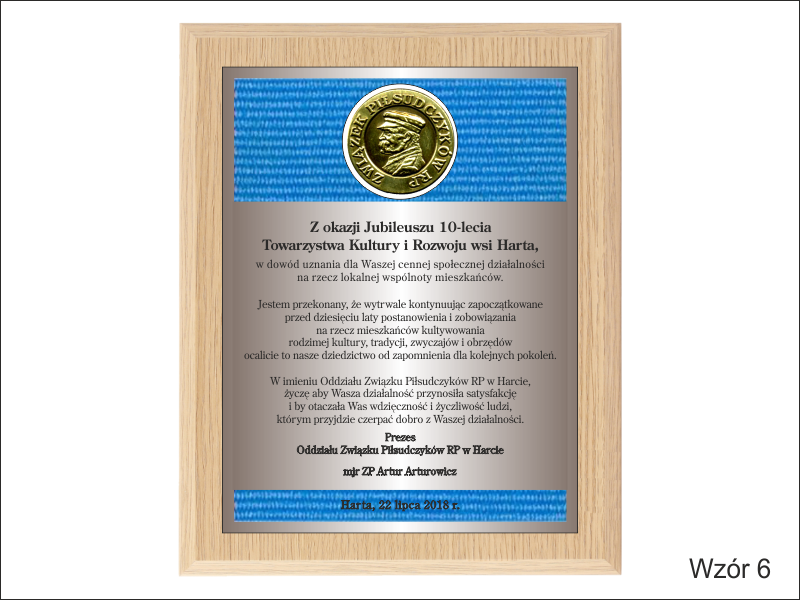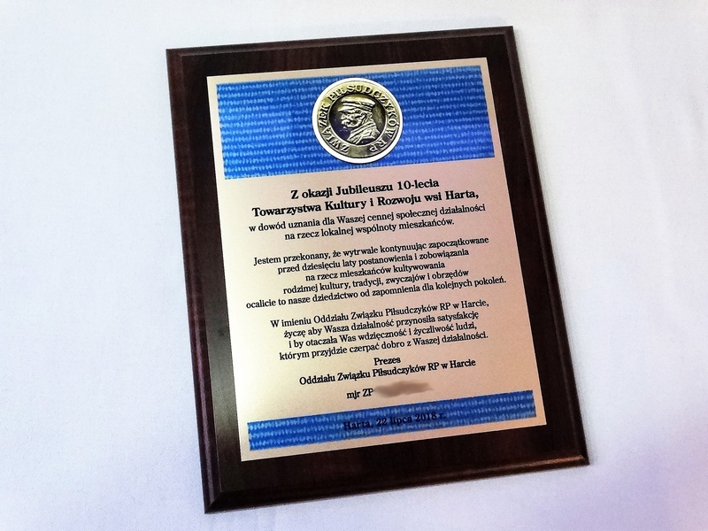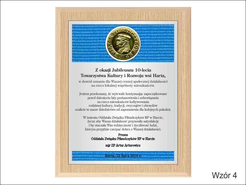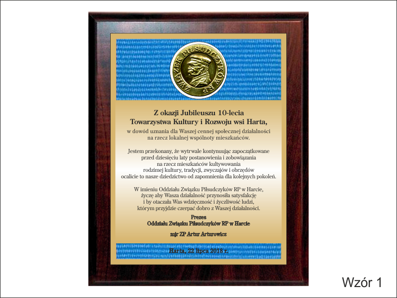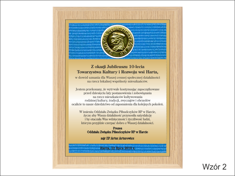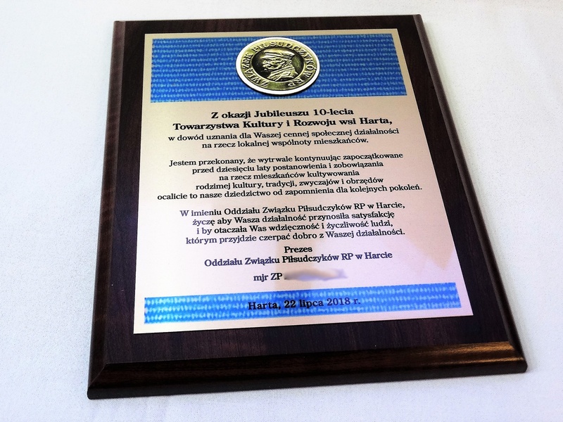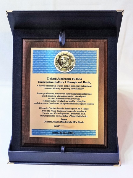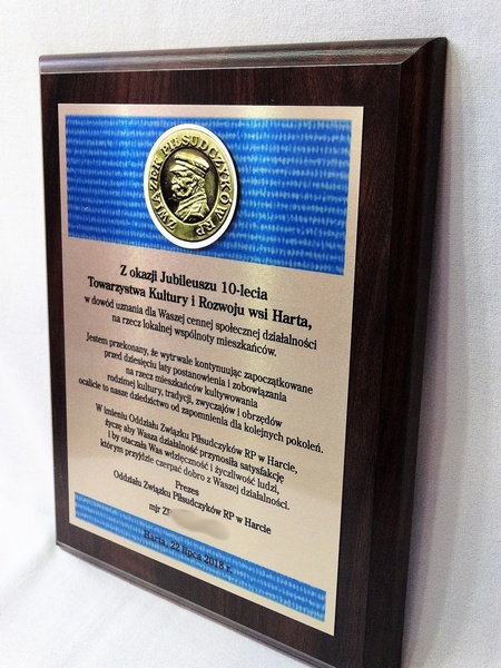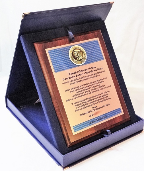 Wyrazy uznania z okazji jubileuszu działalności stowarzyszenia w postaci drewnianego dyplomu z blachą z nadrukiem.