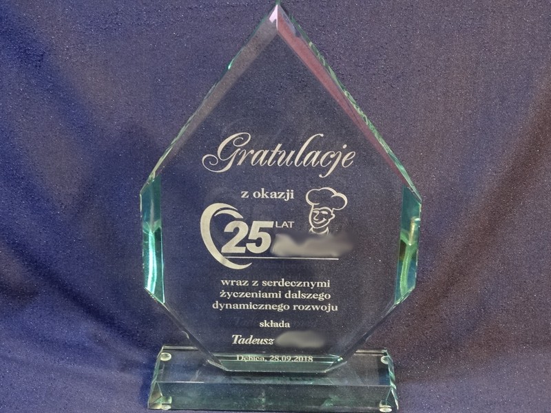 Pamiątkowa statuetka szklana G018 z grubego szlifowanego szkła z grawerem dedykacji z Gratulacjami z okazji Jubileuszu działalności Firmy.